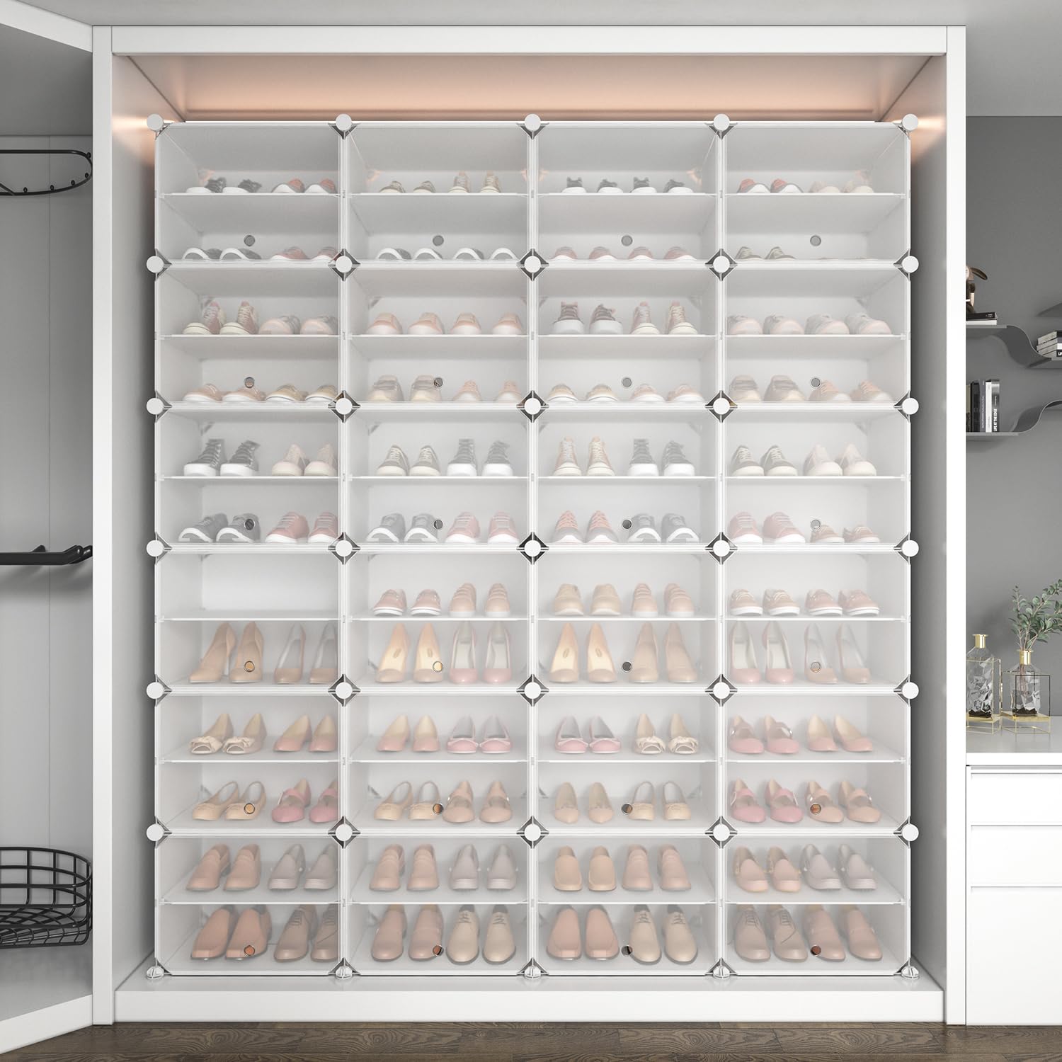 - 【Heavy-duty& Creative Covered Shoe Rack】The shoe storage cabinet are cubic structure, sturdy, durable and no sag during use. Panel is made of high grade eco-friendly resin material that is very strong to bear heavy weight. Big shoe rack has transparent frosted door design, easy to find your shoes quickly.The cubes are easily removable so you can install it the way you want, making shoe rack organizer for bedroom closet of different shapes for storage. Note: Different shapes may result in missing or redundant parts