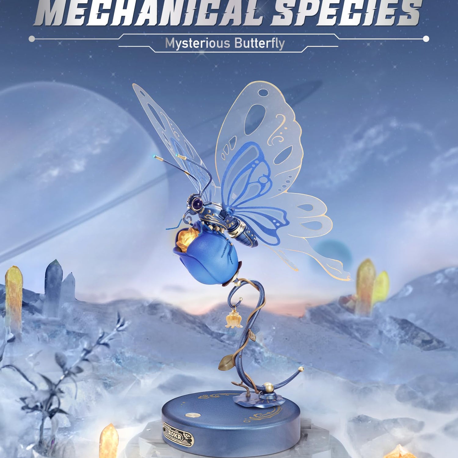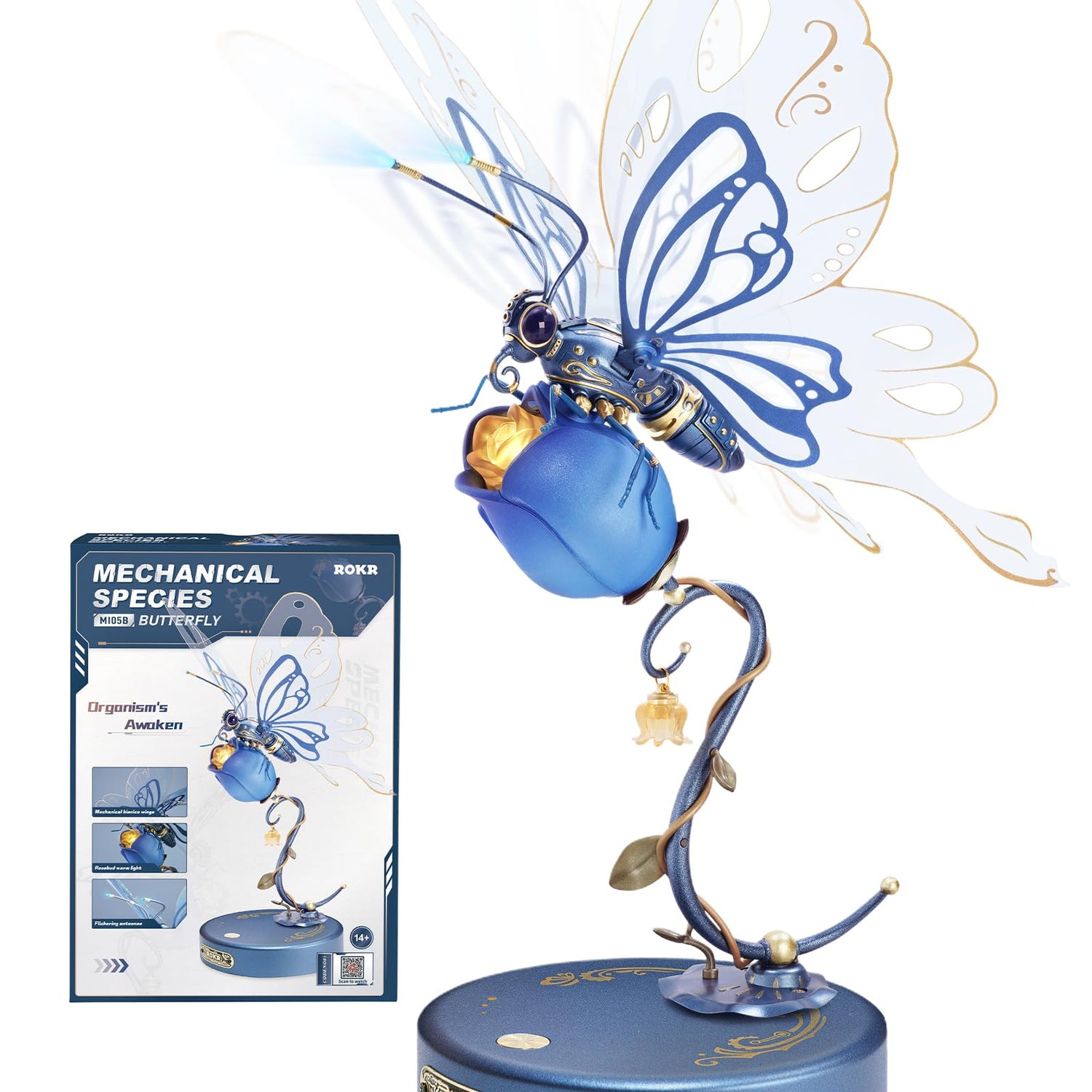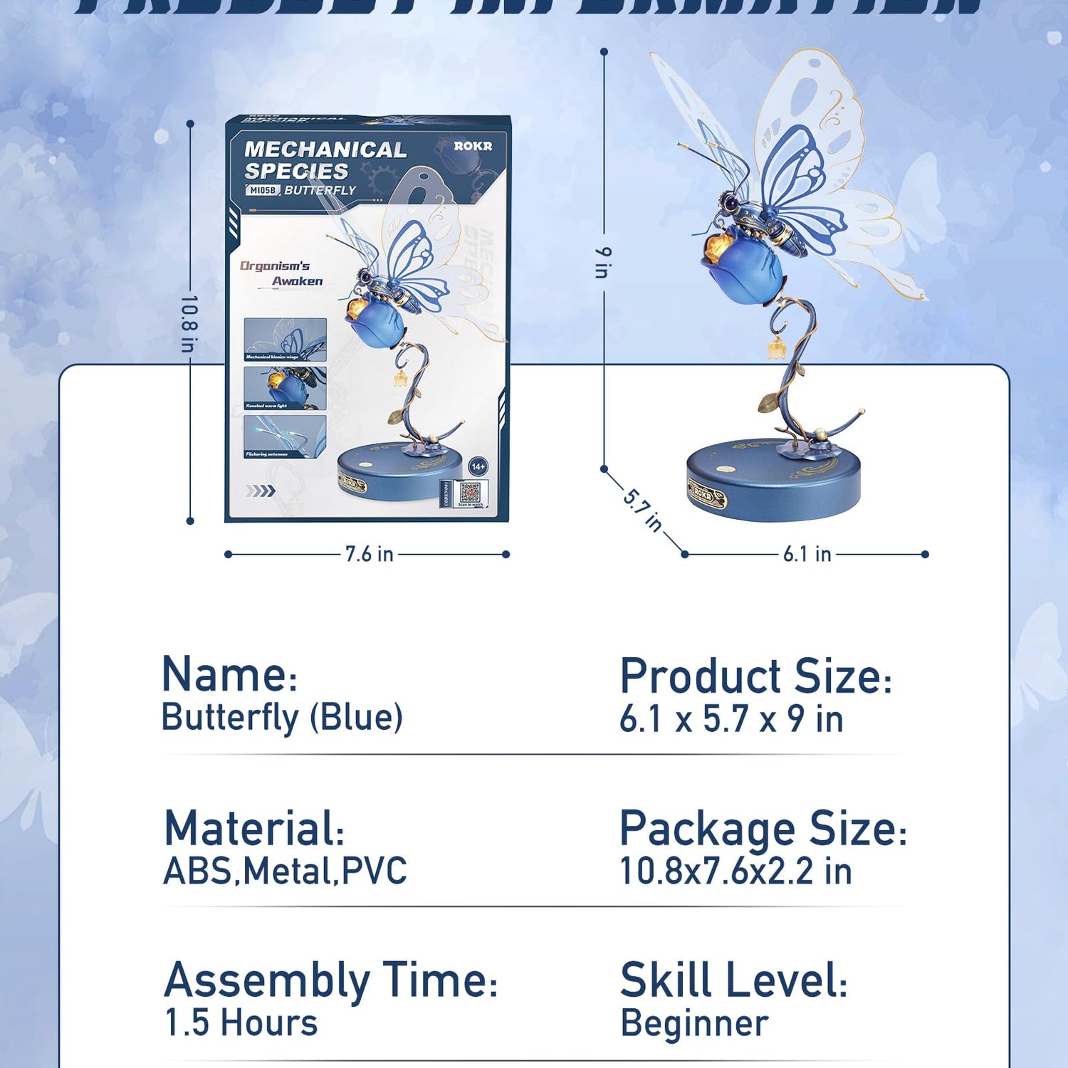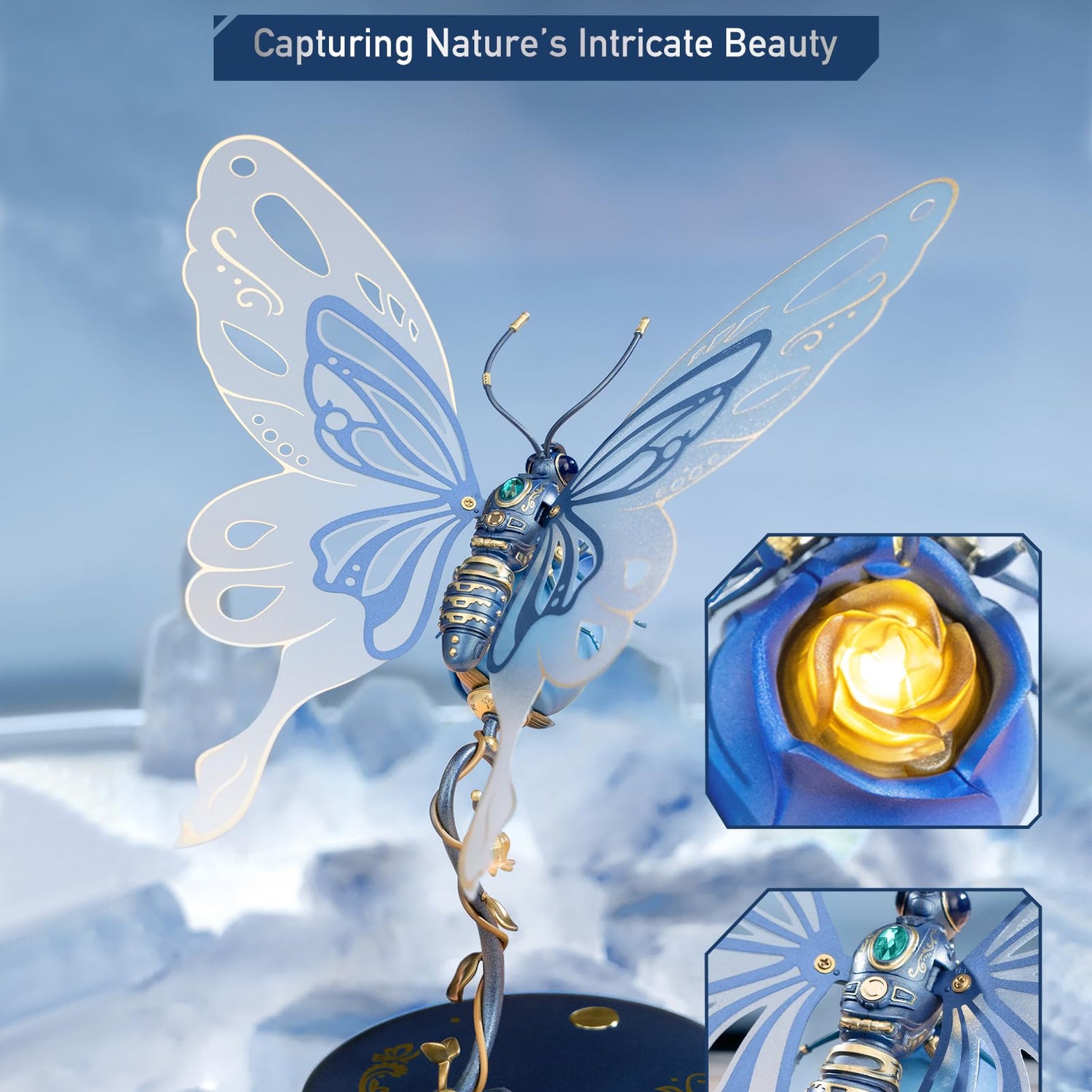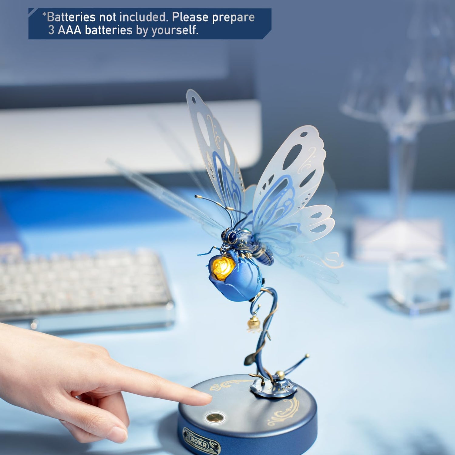 - [ROKR Metal Butterfly] The champagne-hued designs, along with a dazzling gem on its back, lend an elegant flair.Press the switch, 3 LED lights will on and the wings will keep flapping.