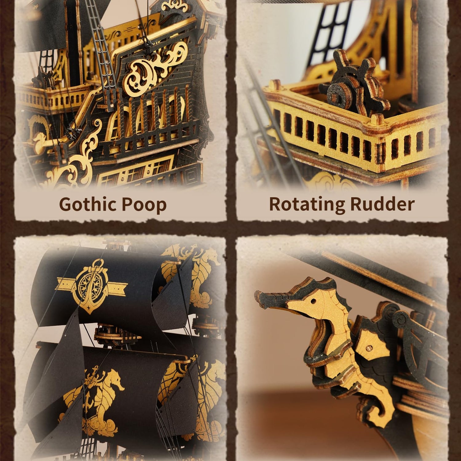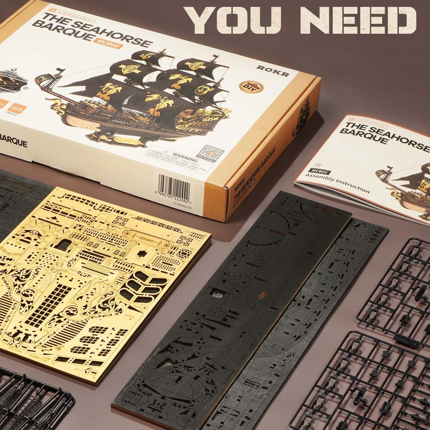 ROKR Seahorse Barque 3D Wooden Puzzle for Adult - Sailboat Model Kit, 603-Piece DIY Assembly, 1:100 Scale Sailboat MCB02
