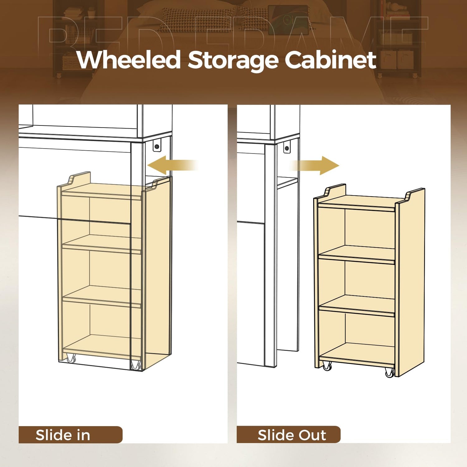 - Practical Bookcase Storage Headboard & Wheeled Cabinet: Elevate your storage options with the 2-tier storage shelf on the headboard, providing ample space for commonly used items like magazines, phones, and alarm clocks. On each side, discover 3-tier storage side tables that can be effortlessly pulled out, perfect for organizing books or personal items. With 10.4" under-bed clearance, meet your daily storage needs, creating a tidy and organized space