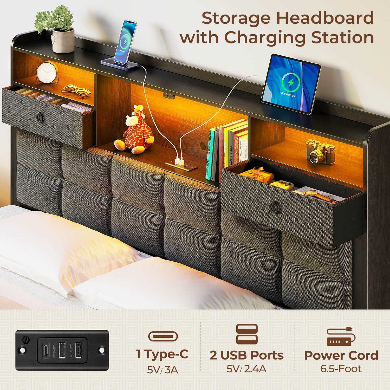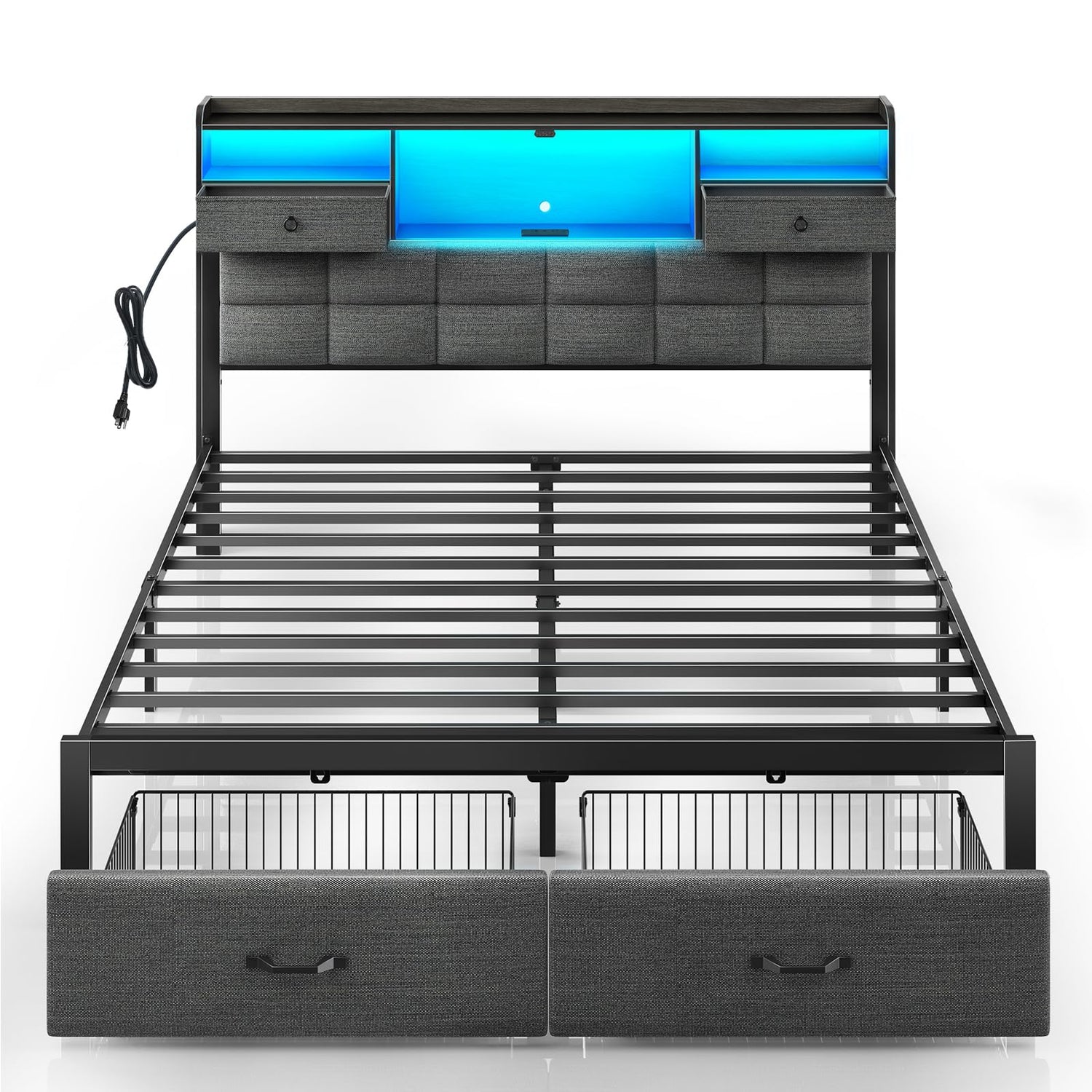Rolanstar Bed Frame Queen Size with Drawers and Charging Station, Upholstered Platform Bed with Storage Headboard and LED Light, Heavy Duty Metal Frame Support, No Box Spring Needed, Noise Free, Grey