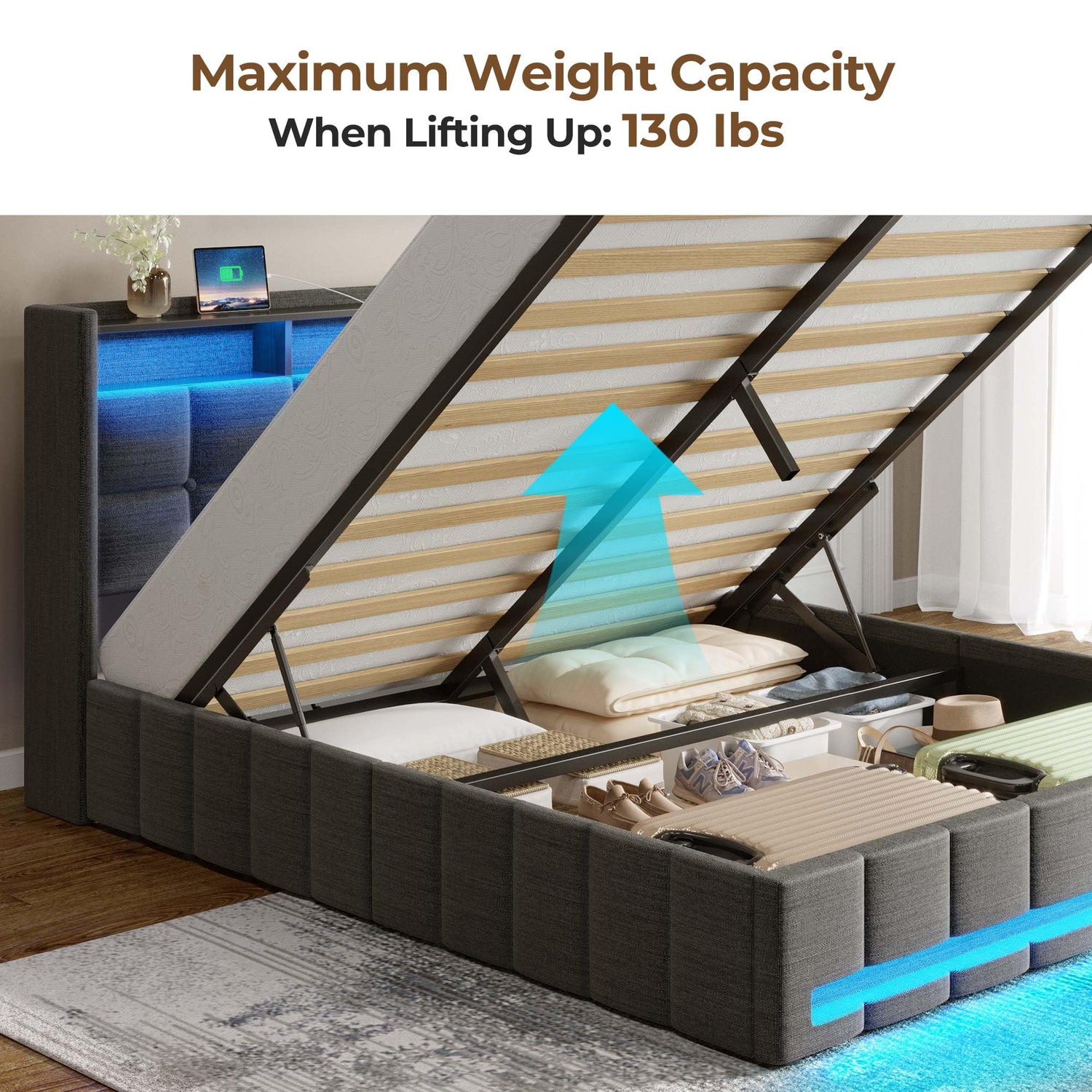 Rolanstar Bed Frame Queen Size with Lift Up Storage, Charging Station & LED Lights, Upholstered Storage Headboard, Heavy Duty Wooden Slats, No Box Spring Needed, Noise Free, Easy Assembly, Dark Grey