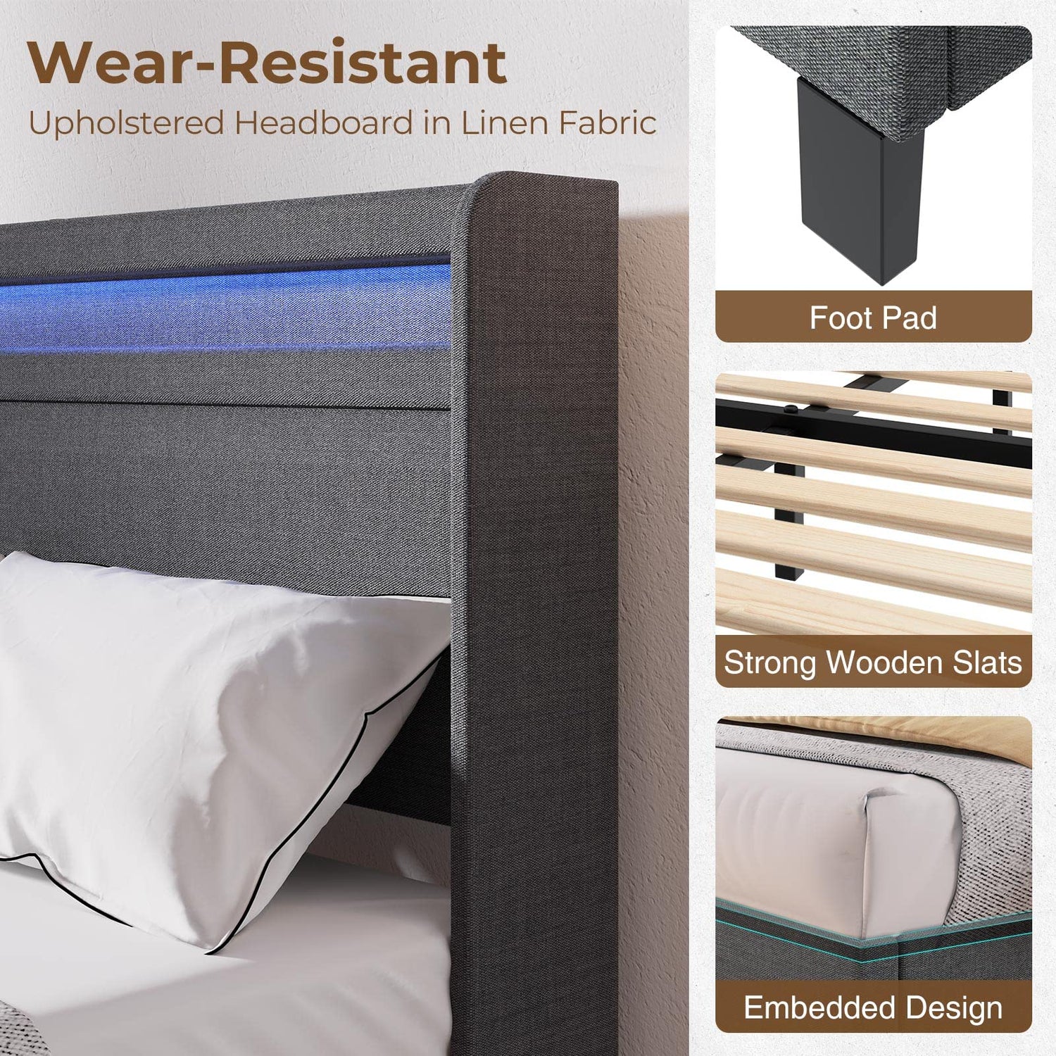 - 【Upholstered Platform with Headboard】The character of breathable and wear-resistant of this fabric offers you and comfortable sleeping night. Furthermore, the dark gray color is a dirty-proof color that minimizes your cleaning troubles.