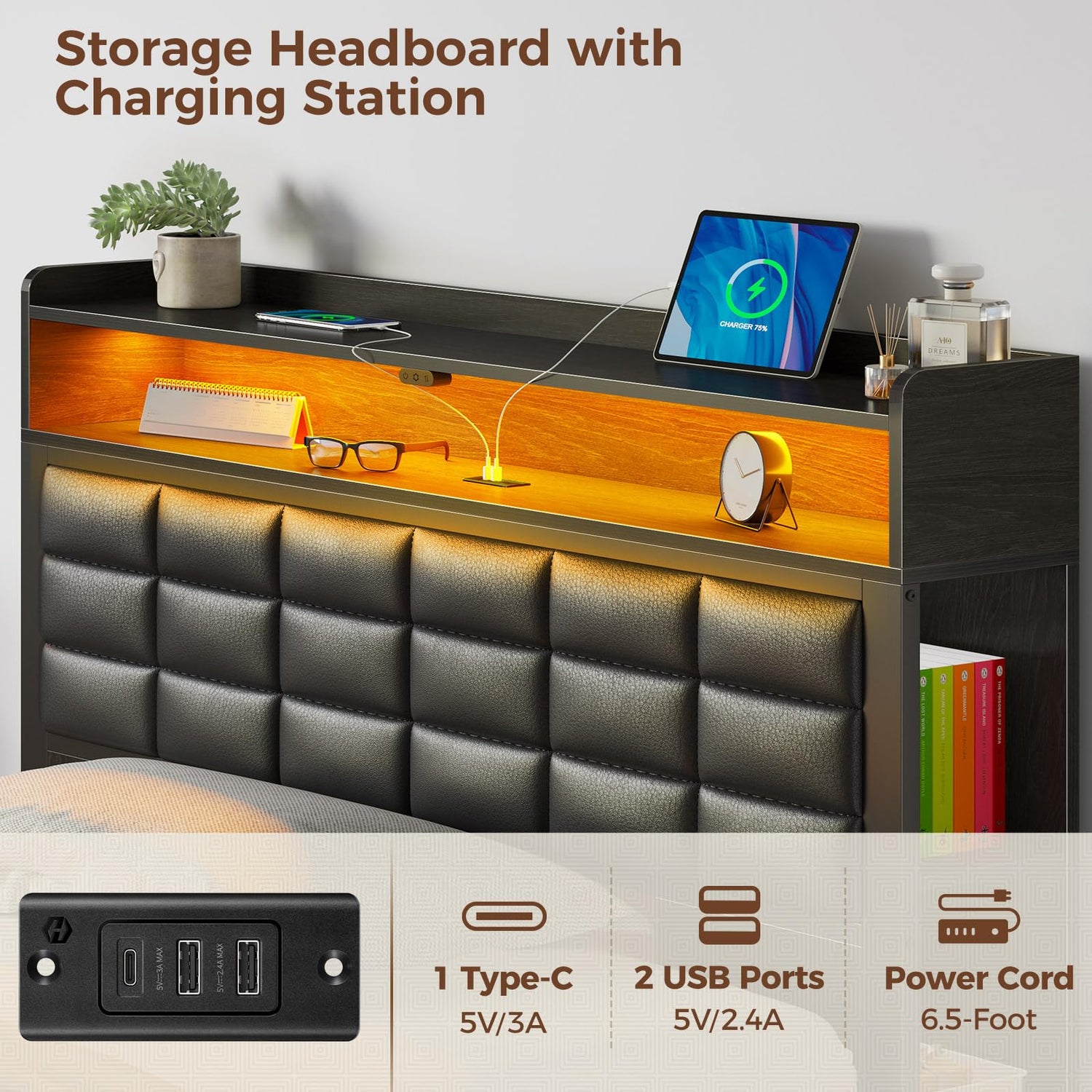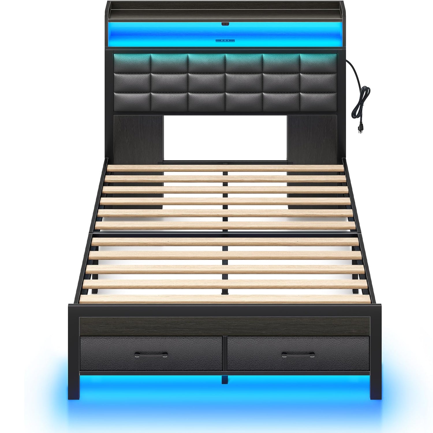 Rolanstar Bed Frame Twin Size with Storage Headboard and 2 Drawers, Upholstered Platform Bed with Charging Station and LED Light, Heavy Duty Frame Support, No Box Spring Needed, Noise Free, Black