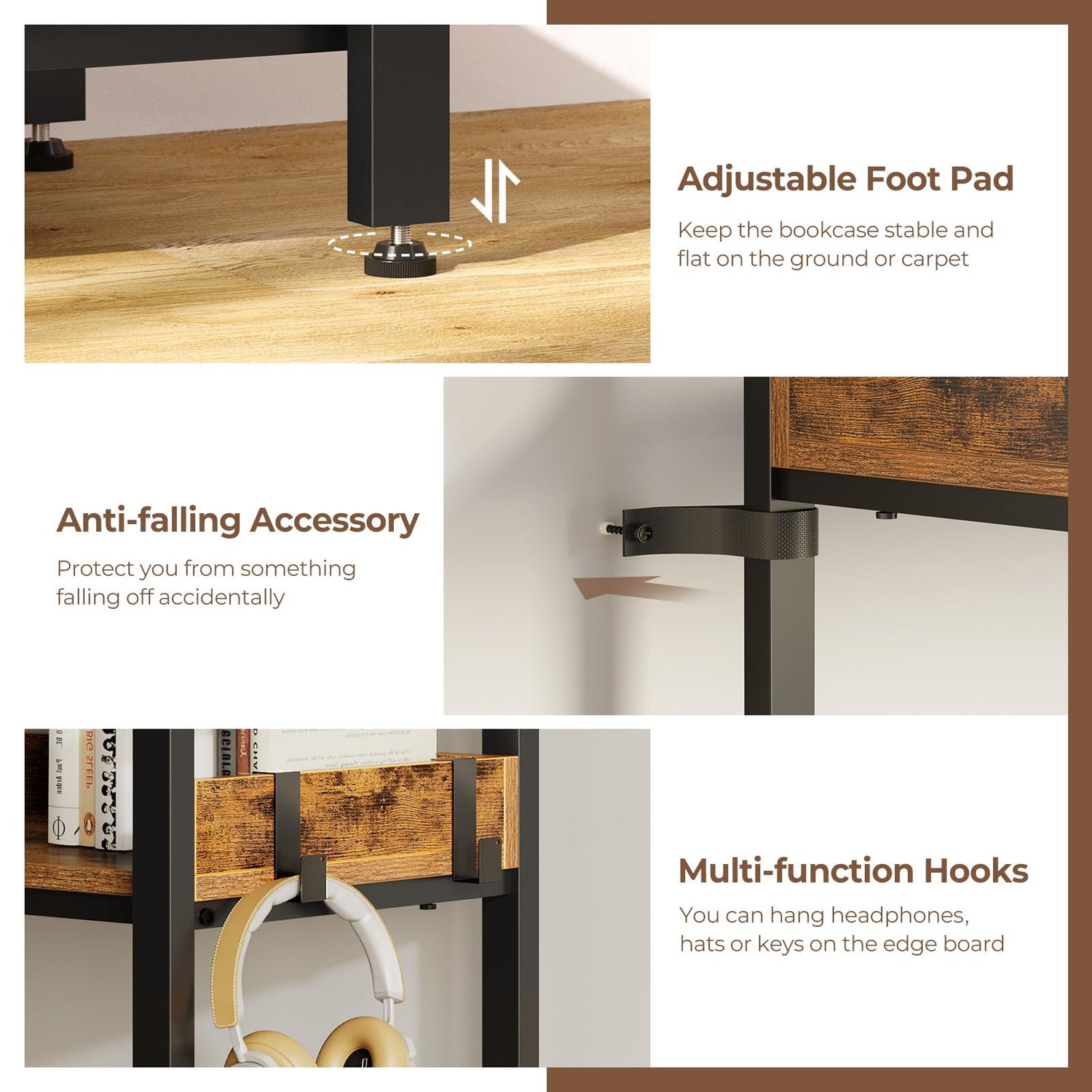 - 4 Storage Hooks and Edge Protection: This bookcase features 4 hooks for convenient hanging of handbags and decorations. Additionally, each shelf is designed with three open edge enclosures to secure your items and prevent accidental falls
