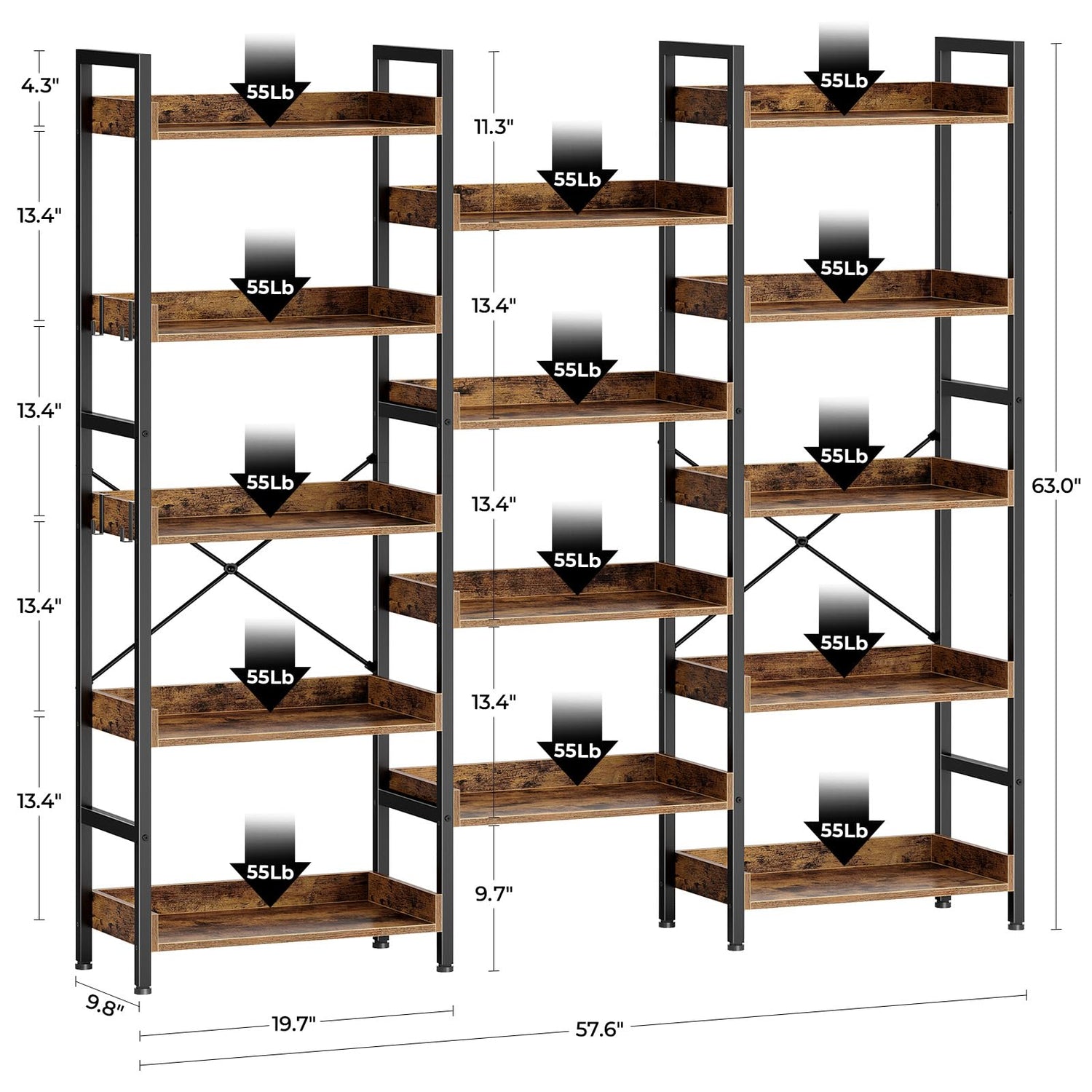 Rolanstar Bookshelf 5 Tiers with 4 Hooks, Triple Bookcase with Open Display Shelves, Industrial Wide Bookshelf with Metal Frame for Living Room, Office, Rustic Brown