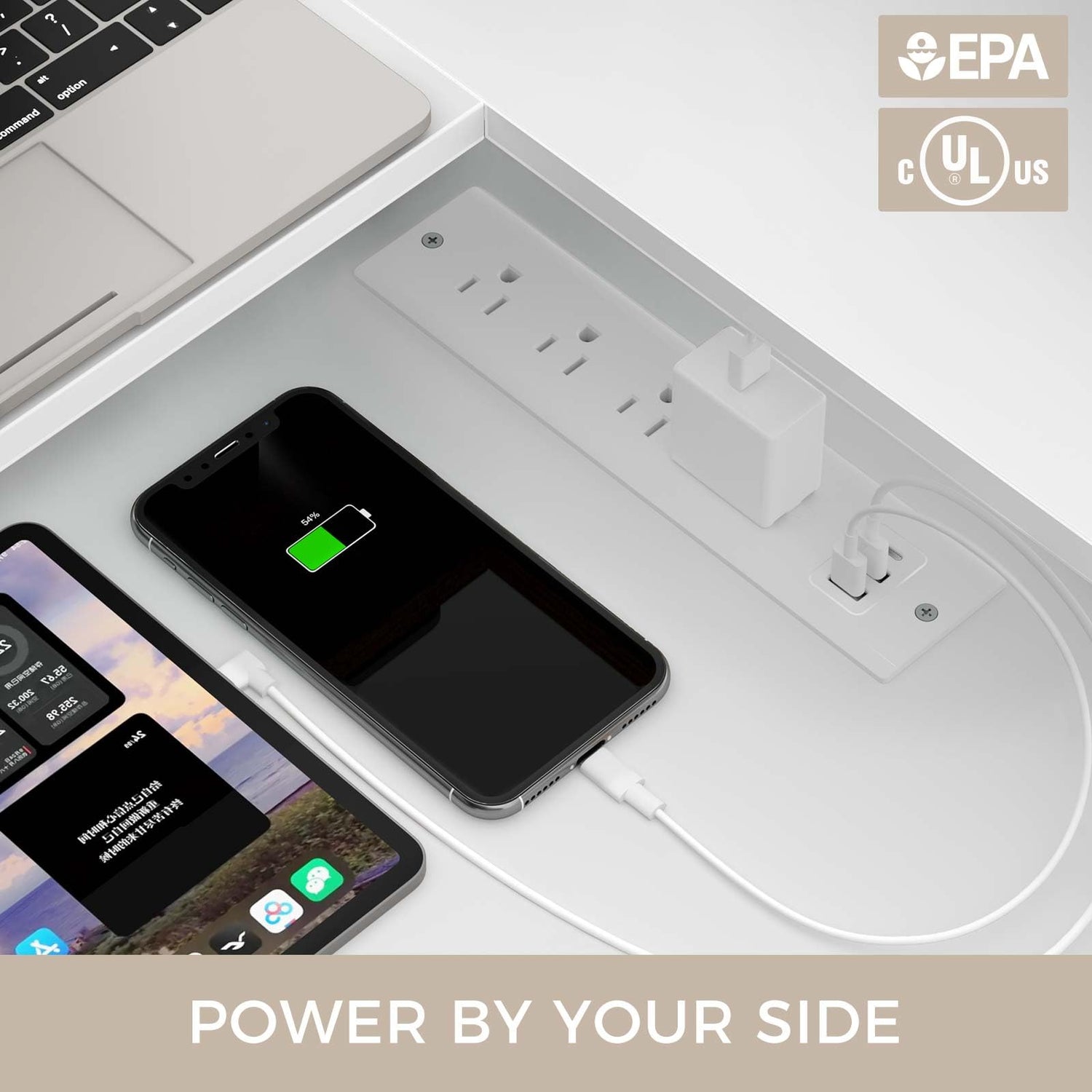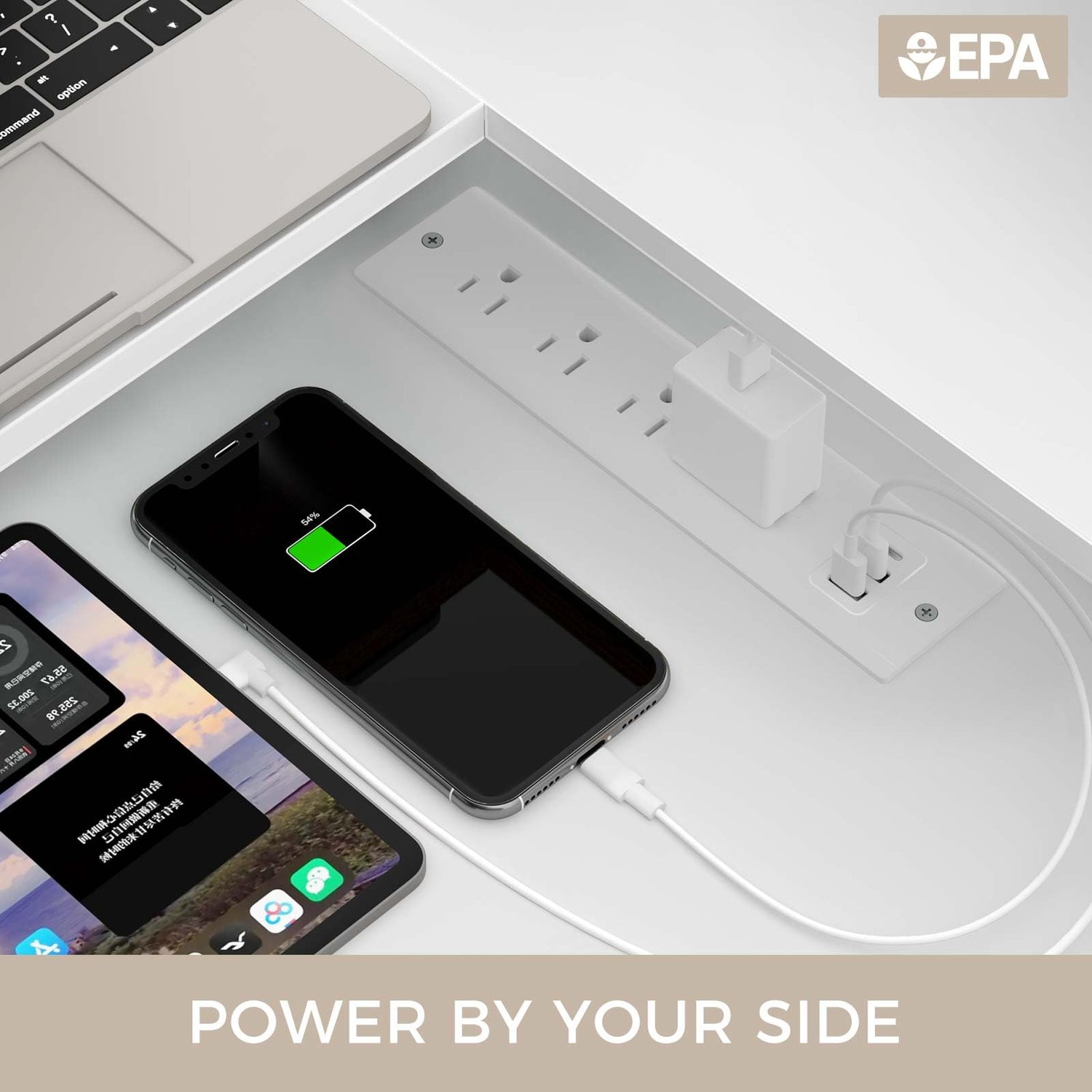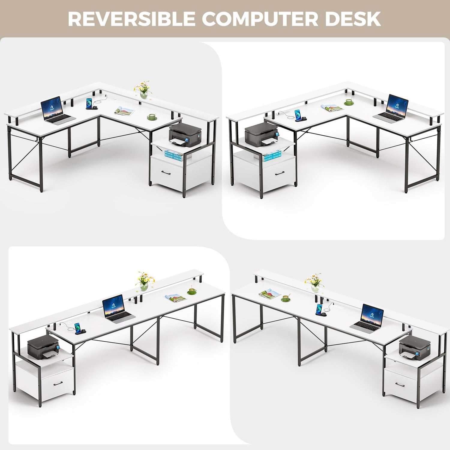 - User Friendly: The L shaped computer desk includes a built-in power strip with 4 outlets & 2 USB Ports provides convenience for charging your gaming gear, tablet、printer or phone.Don't worry about not having enough power sockets.This computer desk can also be freely deformed into a long square or L-shaped desk according to your use needs. Please note that the file cabinet of the computer desk can only be installed on the right side