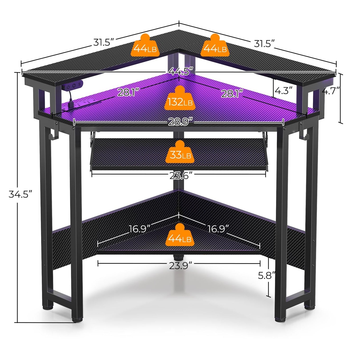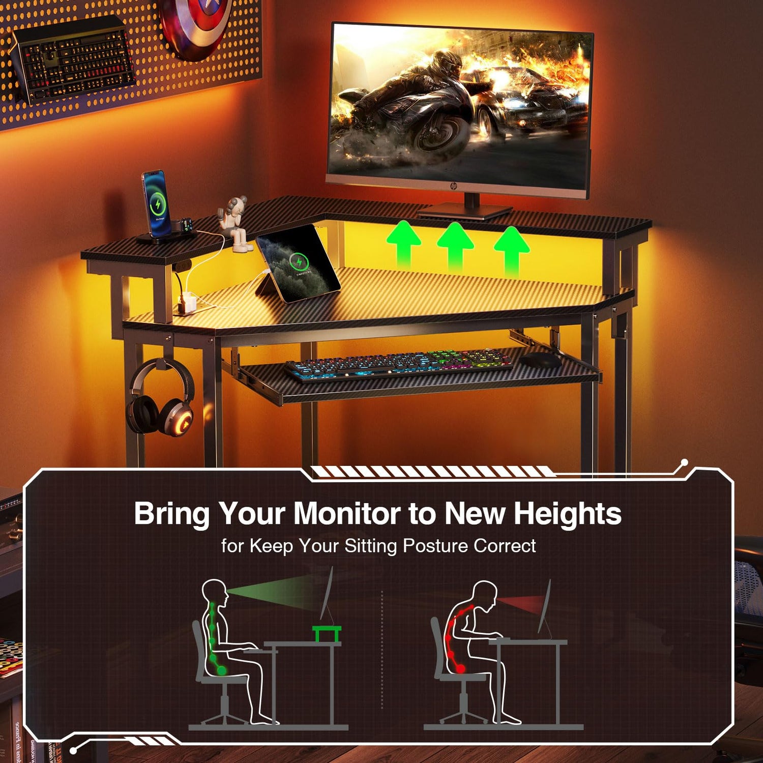 Rolanstar Corner Desk, 44.5" W x 34.5" H Small Carbon Fiber Computer Desk with Power Outlets, LED Lights and Keyboard Tray, Small Office Computer Desk with Monitor Stand for Small Space, Carbon Black
