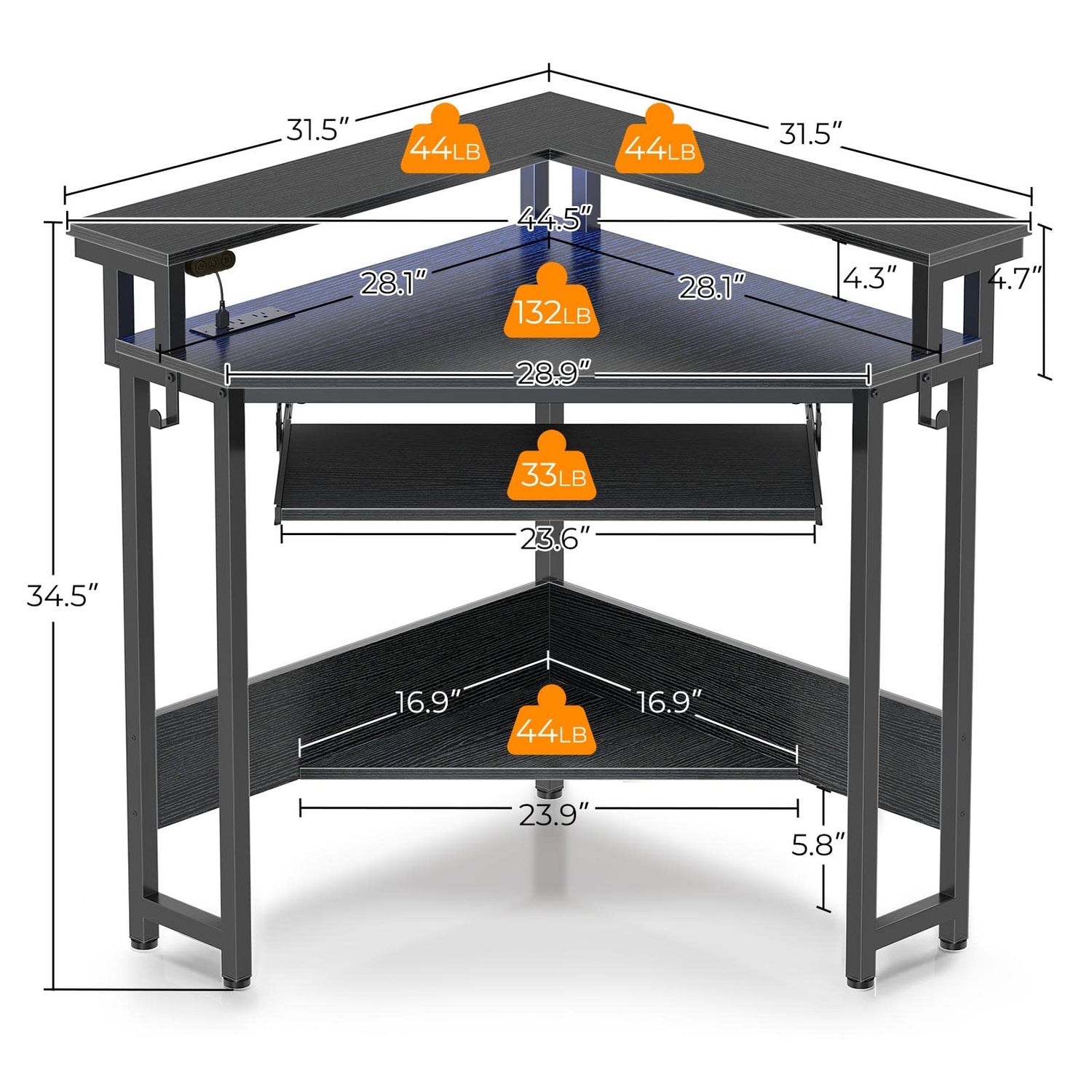 Rolanstar Corner Desk, 44.5" W x 34.5" H Small Computer Desk with Power Outlets, Gaming Desk with LED Lights, Triangle Corner Desk with Keyboard Tray & Monitor Stand for Small Space, Black
