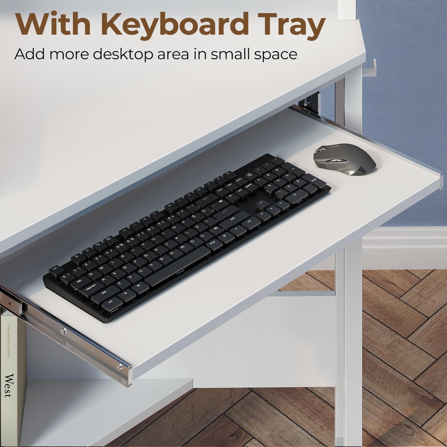 - Full-Size Monitor Stand & Bottom Storage: Our uniquely designed full-size monitor stand and keyboard tray, which can hold two monitors, ensures that your line of sight and your monitor are always parallel when you sit at this computer desk, protecting your spine's health. Additional storage shelves at the bottom for books, small printer and other daily use things, increasing storage space