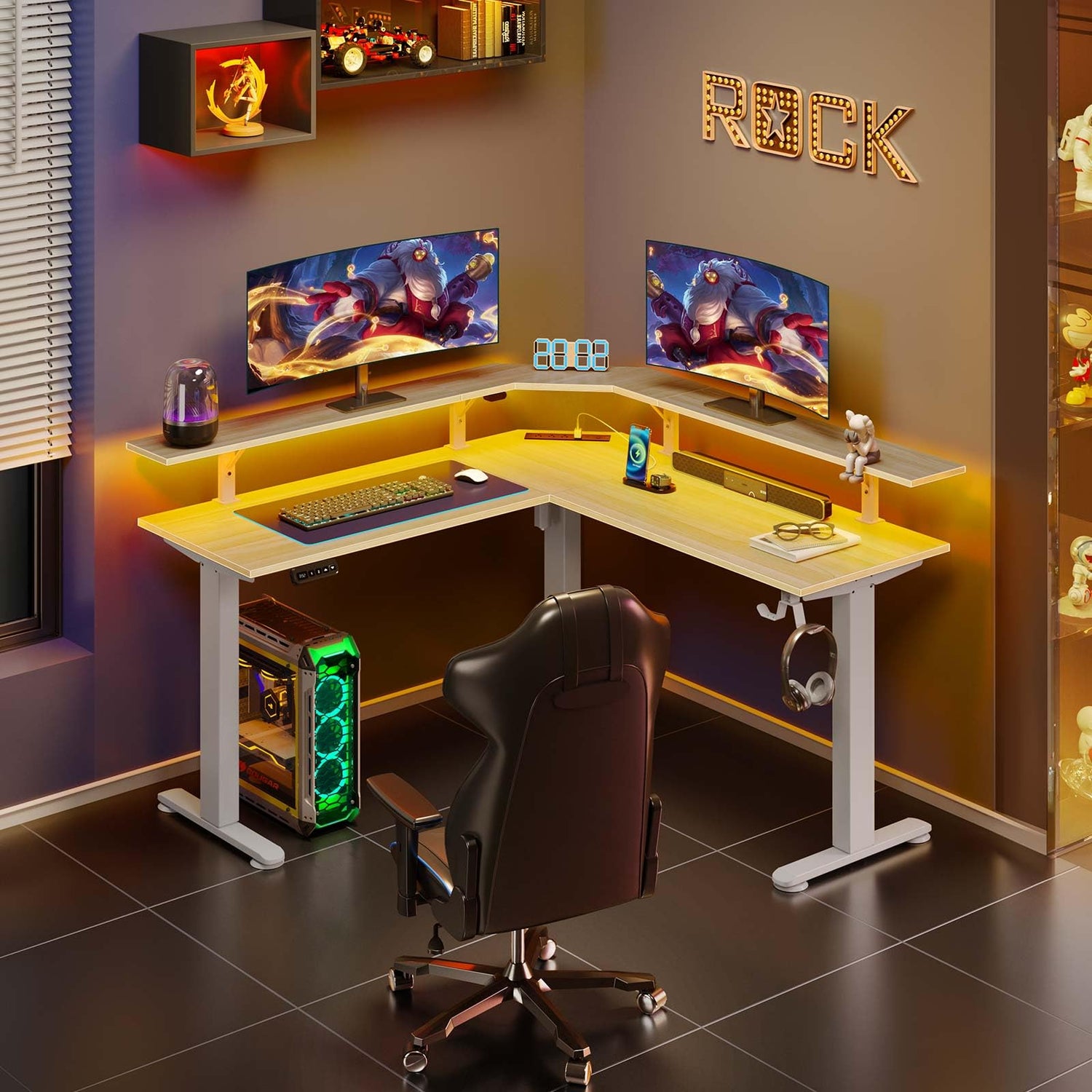 Rolanstar Standing Desk L Shaped with LED Light and Power Outlet, Electric Height Adjustable Computer Office Desk Sit Stand Up with Monitor Stand, Beige