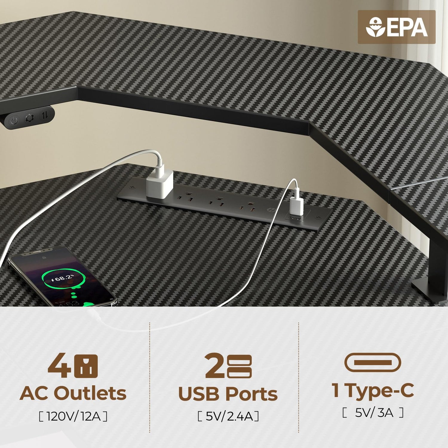 Rolanstar Standing Desk L Shaped with LED Light and Power Outlet, Electric Height Adjustable Desk with Monitor Stand, Carbon Fiber