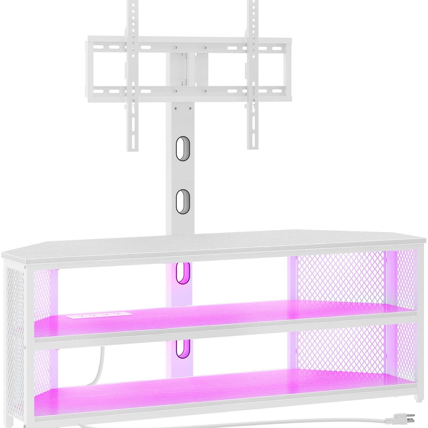 - TV Stand with Mount: Can’t bear a TV stand with no storage? Worried about the TV falling off? Pick this new corner TV stand with storage. This TV stand features a built-in TV mount for a flat screen up to 70" and it base pairs with wooden frame and steel bar support. It includes 3 open shelves for holding a sound bar, cable box, game console, DVD player