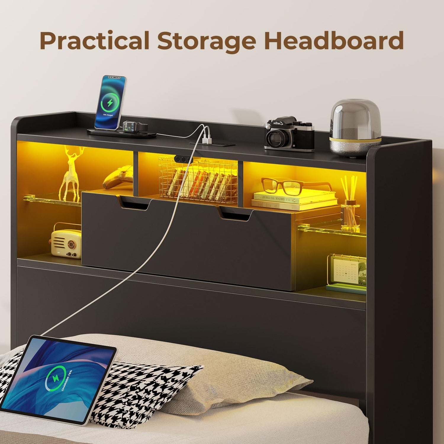 - Bookcase Headboard Storage: Elevate your bedroom with the Rolanstar Bed, which includes a headboard with three tiers of storage shelves, two spacious hidden compartments, and five open compartments. Perfect for organizing your essentials like alarm clocks, books, glasses, and picture frames. The glass dividers add a modern flair to your bedroom decor