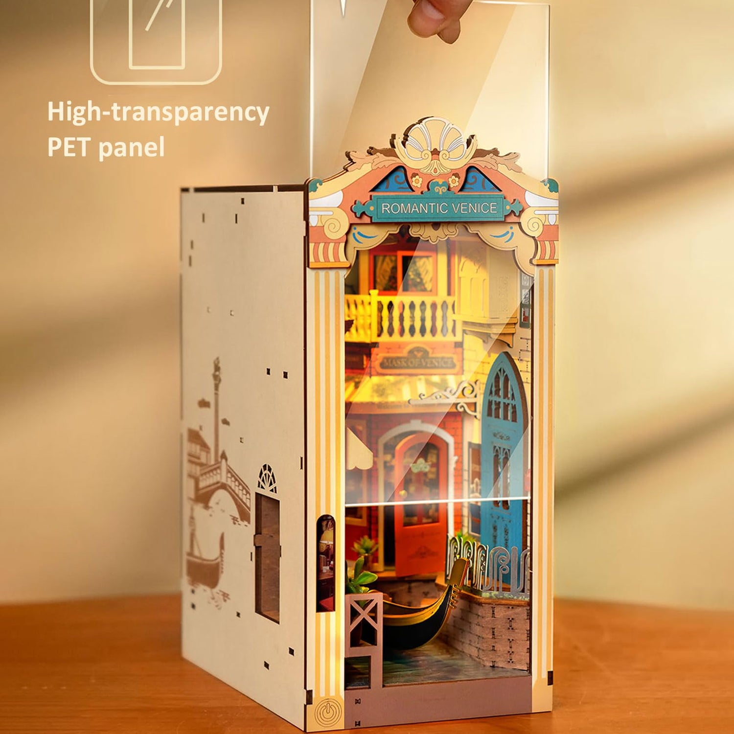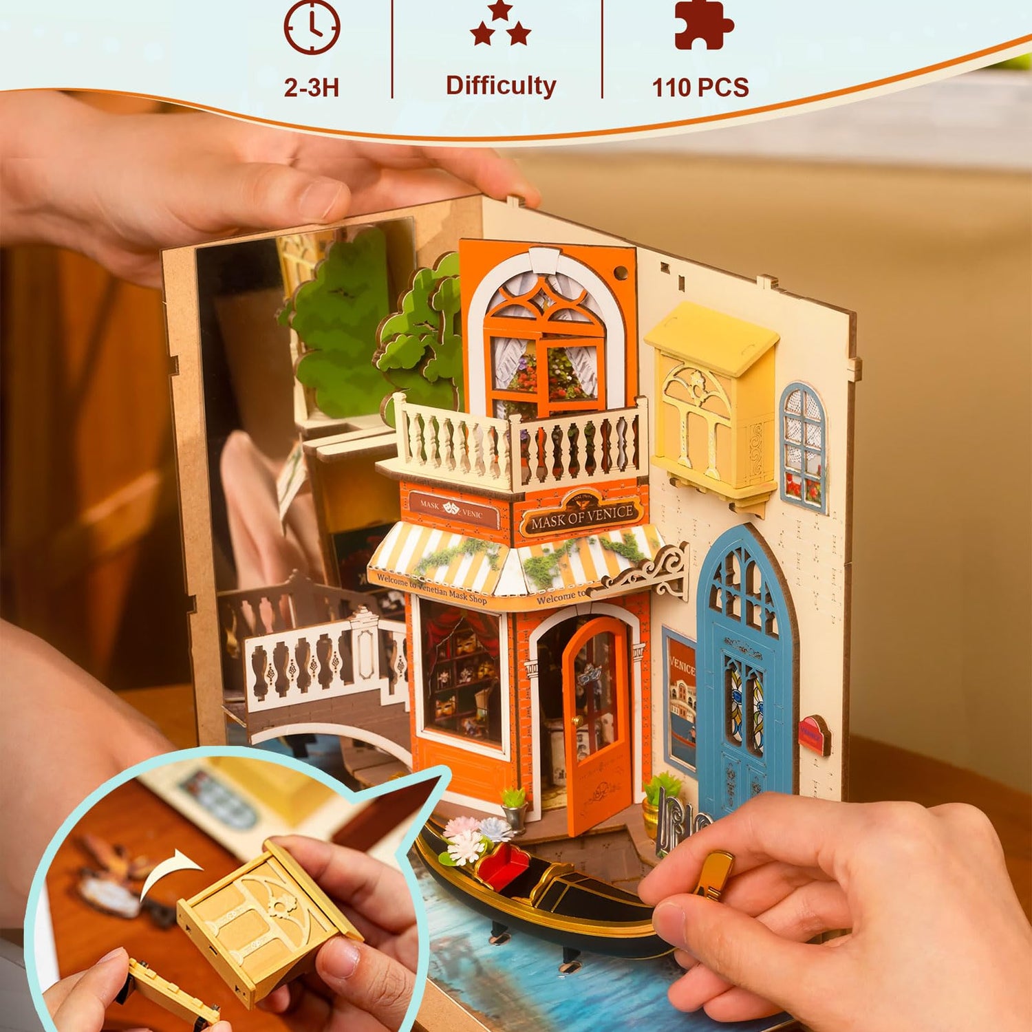 - [Bring Venice to Your Home]: Transform your bookshelf into a Venetian scene with iconic landmarks such as canals, charming gondolas, quaint mask shop, architectures. The stunning book nook kit captures the timeless beauty and atmosphere of Italy's most romantic city.