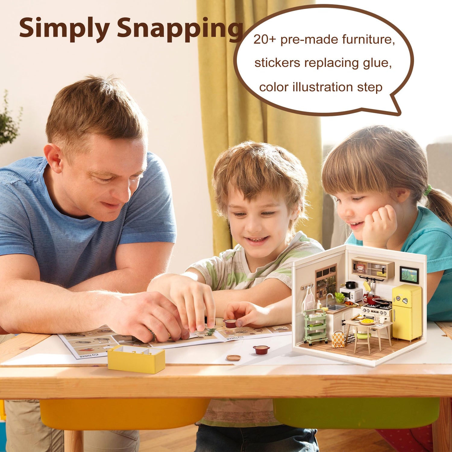 - 【Build Delicious Kitchen】Rolife DIY kitchen miniature kit features one-room main body with surpriseing details and pre-made furniature: a gar range with oven which can light up, a wall cabinet full of snacks and cups, a refrigerator with actual storage case, etc.