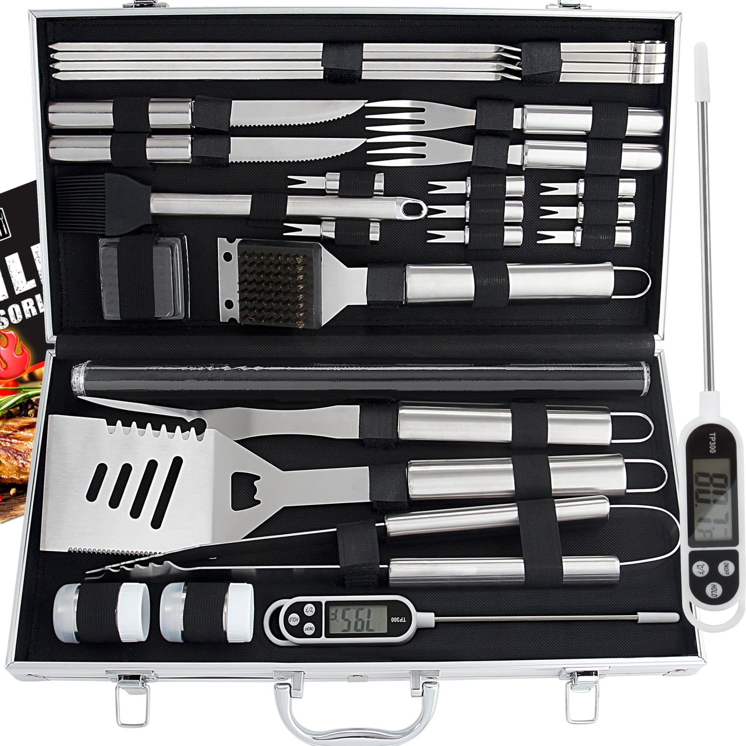 - The most Versatile BBQ Tool Set - Spatula, fork, 2 barbecue mats, tongs, basting brush, grill brush, extra brush head, meat thermometer, 2 steak knives&forks, 2 shakers, 8 corn holders, 4 skewers, aluminum case.