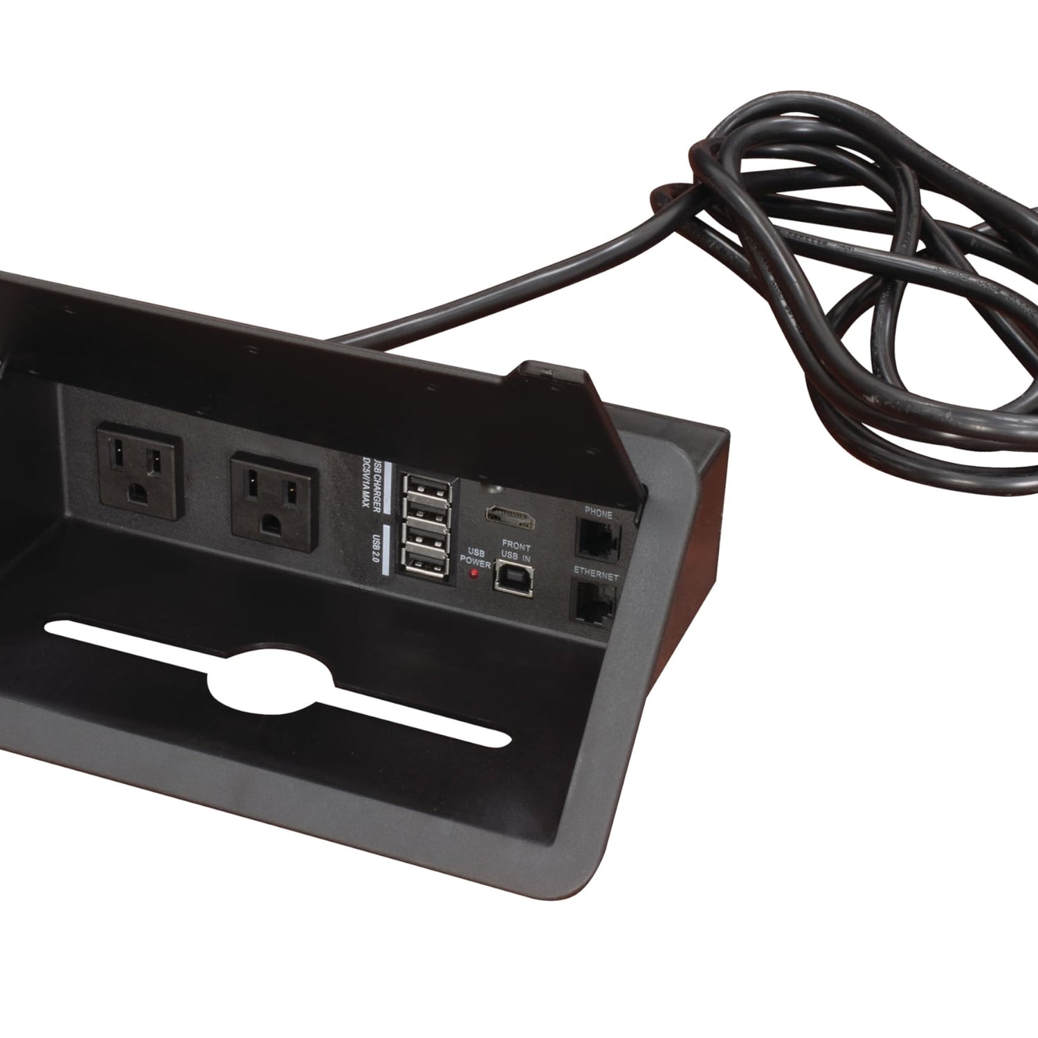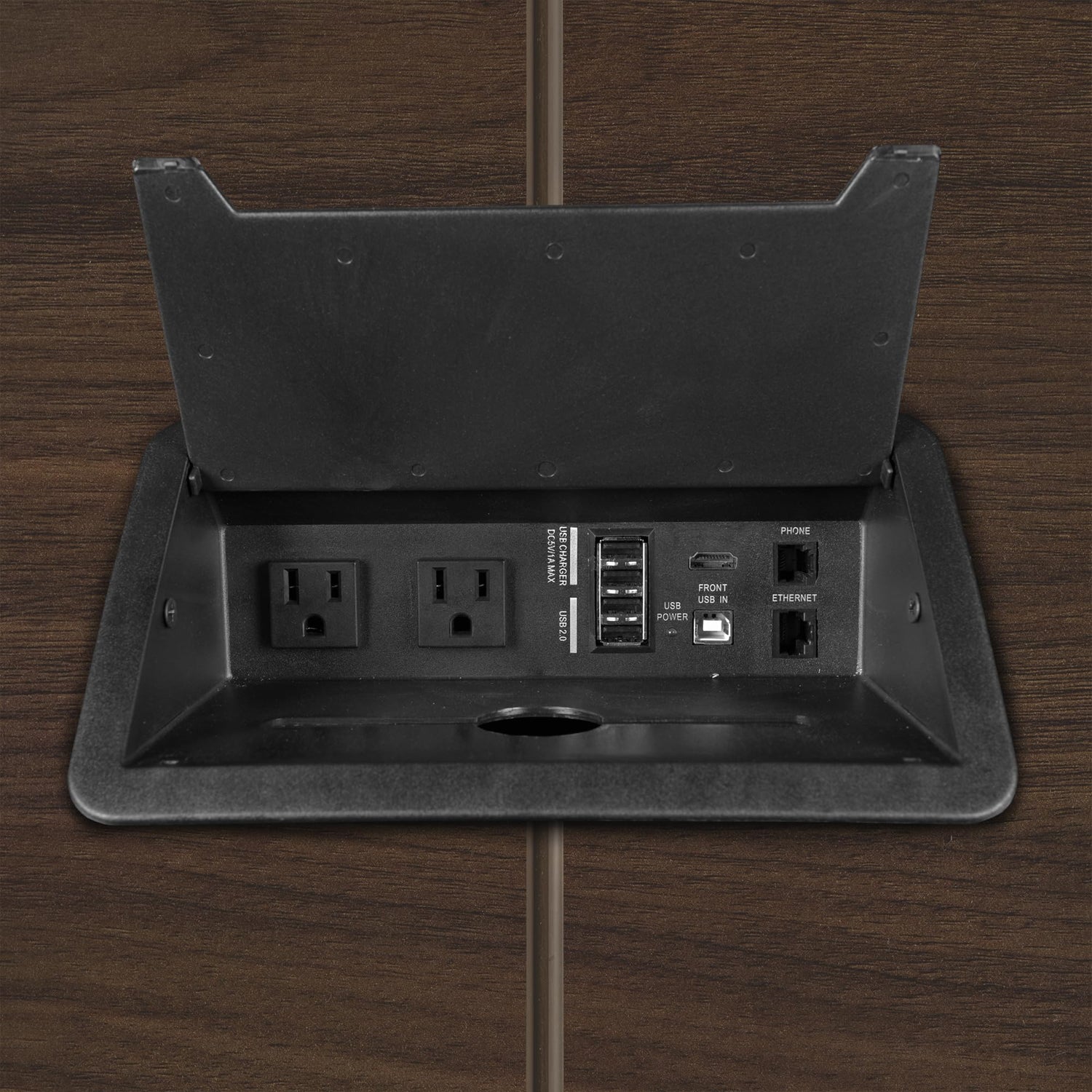 Details: Make presentations memorable with Legacy's Conference collection! With tables that seat from two up to 24 people, there is a table for any size team. This 10-foot racetrack table comes in an stylish Neo Walnut finish and seats 8 - 10 people. Adjustable glides on the bottom of the base keep the tabletop level and are easy to adjust. A Power and Data Port makes tabletop connectivity easy. The Power/Data port includes (2) USB 2.0 ports, (2) USB charging ports, (2) AC 125V 60Hz outlets, (1) front/rear ethernet port, (1) front/rear phone port and has a black cover plate for a neat, clean look. The Legacy collection is constructed of a 1-inch thick thermal fused melamine laminate with a 3-millimeter commercial grade matching PVC edge. Laminates are scratch, stain and scald resistant. Legacy casegoods are backed by a 10-year limited manufacturer's warranty.