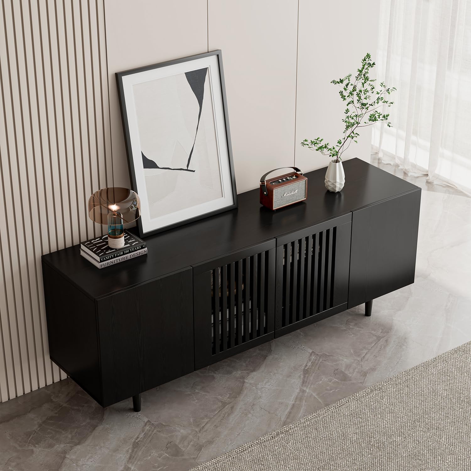 - Stylish and Functional Design: This black TV stand features a sleek design that enhances any living room decor; The unique grille-striped doors add an elegant touch while providing essential storage for your entertainment center