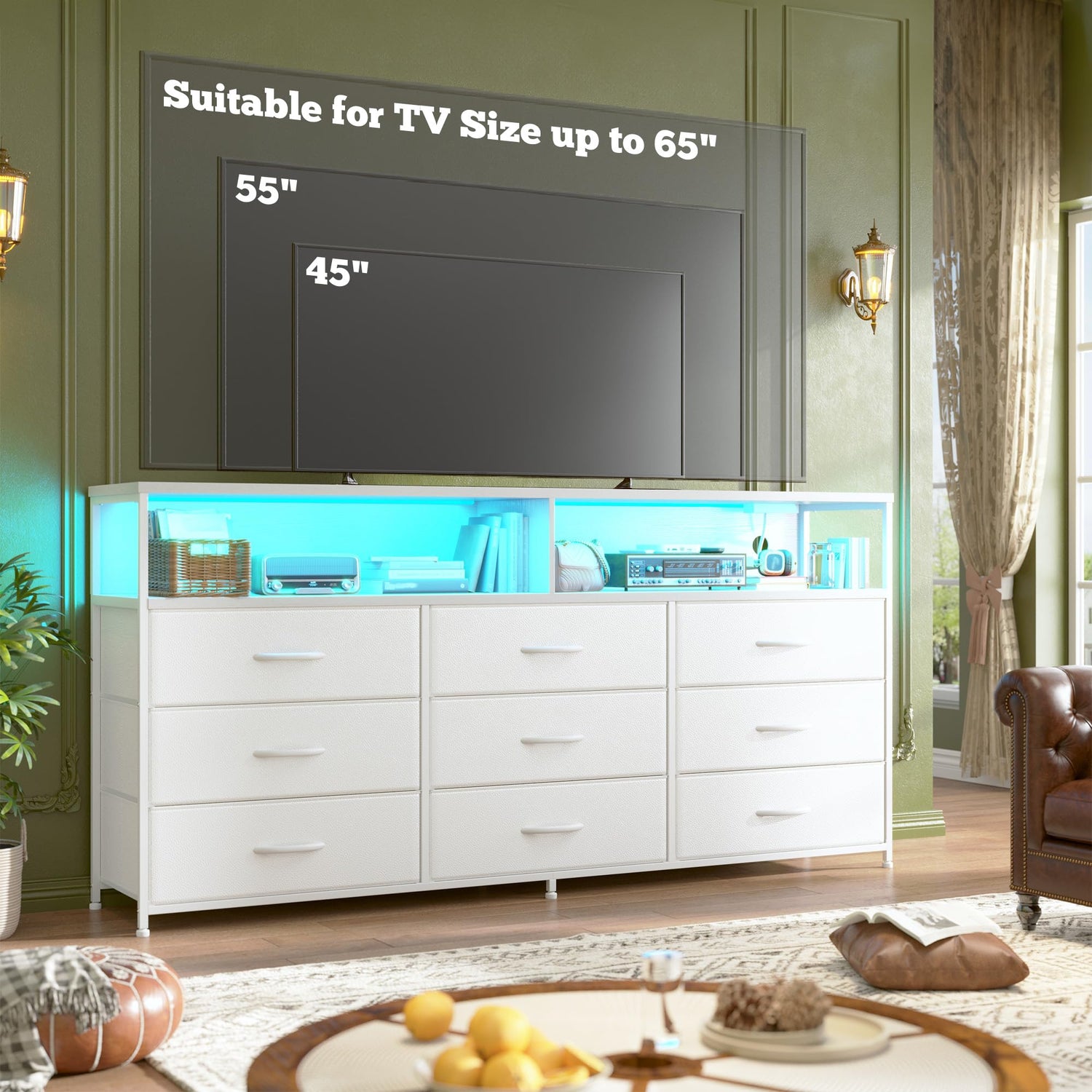 - 【Long Dresser TV Stand with Ample Space】 This Bedroom Dresser measures 55.1"W, 11.8" D, and 35.4" H. It features two-tier wooden shelves—a spacious top surface that can accommodate a 65-inch TV, and a lower shelf perfect for DVDs, books, or photo albums.The dresser for bedroom includes 9 large foldable fabric drawers, ideal for storing blankets, and towels. This versatile dresser keeps your belongings neatly organized yet out of sight