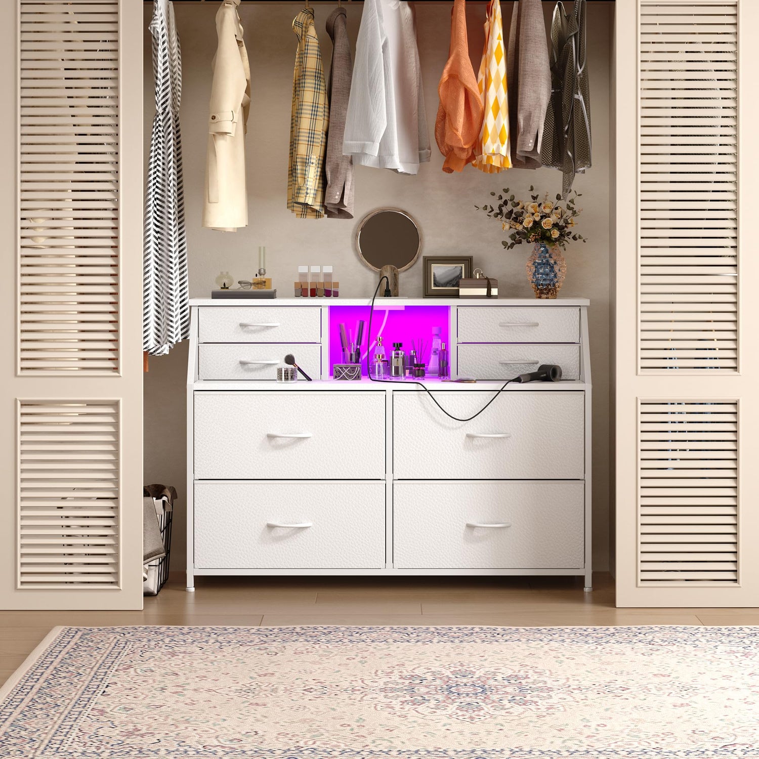 - 【Charging Station and LED Lights】This 8-drawer dresser combines a charging station (2 AC outlets and 2 USB ports) and LED light (7 dynamic color modes and 7 static color modes), perfectly practicably. With the included remote control, you can effortlessly adjust the lighting to create your ideal atmosphere. Stay connected with the built-in USB charging hub (compatible with phones, tablets, and smart devices), handily charging multiple devices in your bedroom, living room and entryway