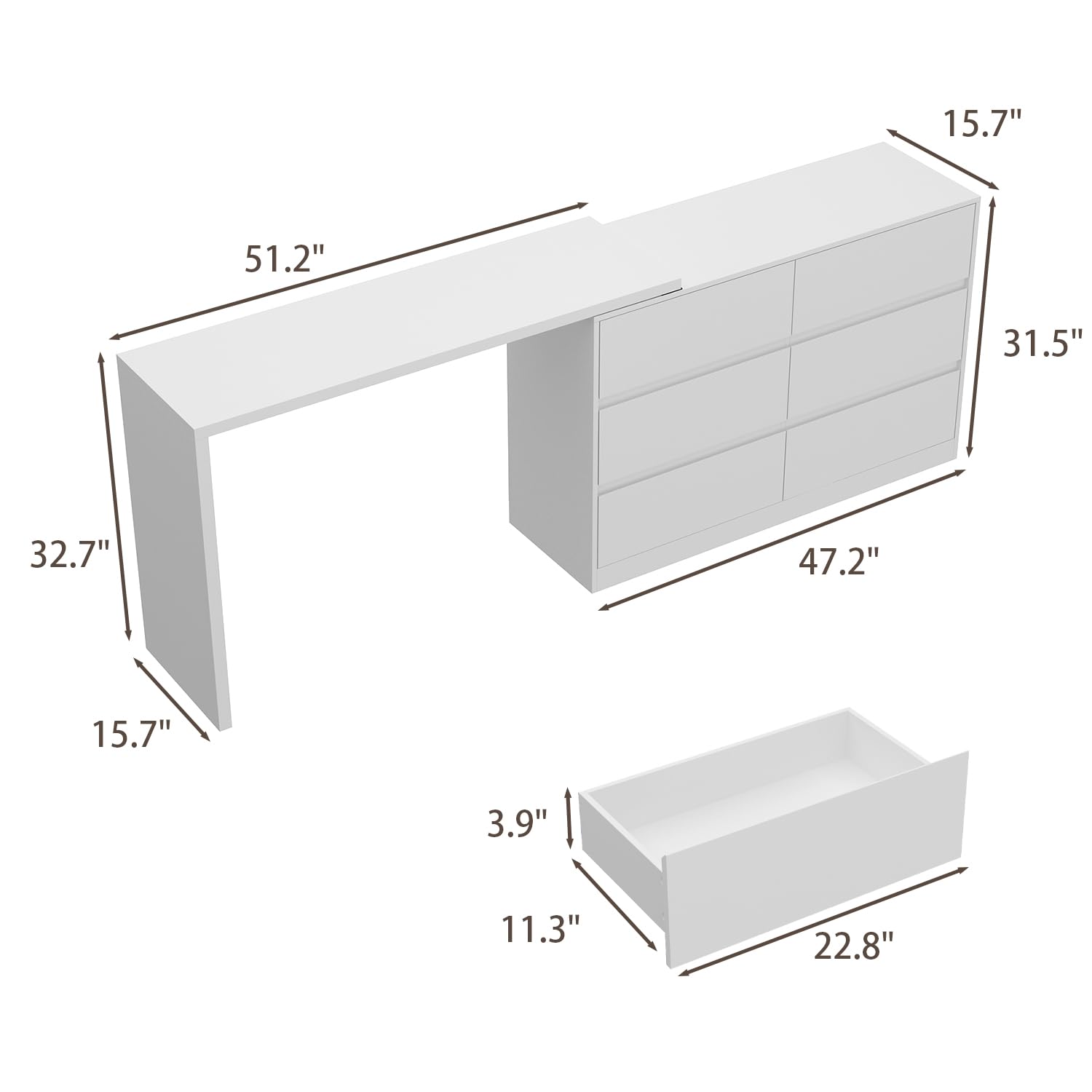 ROMSHINE 6 Drawer Dresser with Rotatable Tabletop, Modern Chest of Drawers with Extendable Desk (No More Than 98" W), Drawer Organizer for Bedroom Home Office, White Dresser