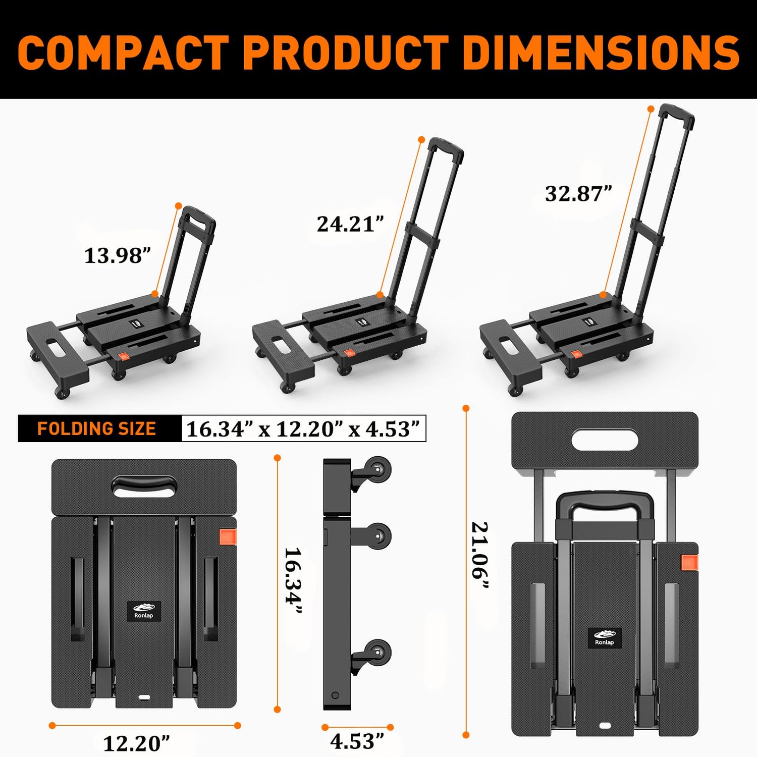 - 【Flat Folding Design】: Weighing only 8.6 pounds, folding size: 16.34 x 12.20 x 4.53 inches, expansion size: 21.06 x 12.20 x 4.53 inches. Before acquiring, please carefully review the product specifications to ensure that the dimensions of the hand truck meet your usage requirements. This foldable dolly cart is easy to fold or unfold in a few seconds. Thanks to a unique and innovative fold-flat design, this foldable dolly cart is convenient for carrying or easy storage in a car's trunk, under a bed, in a closet, storage rooms or garages