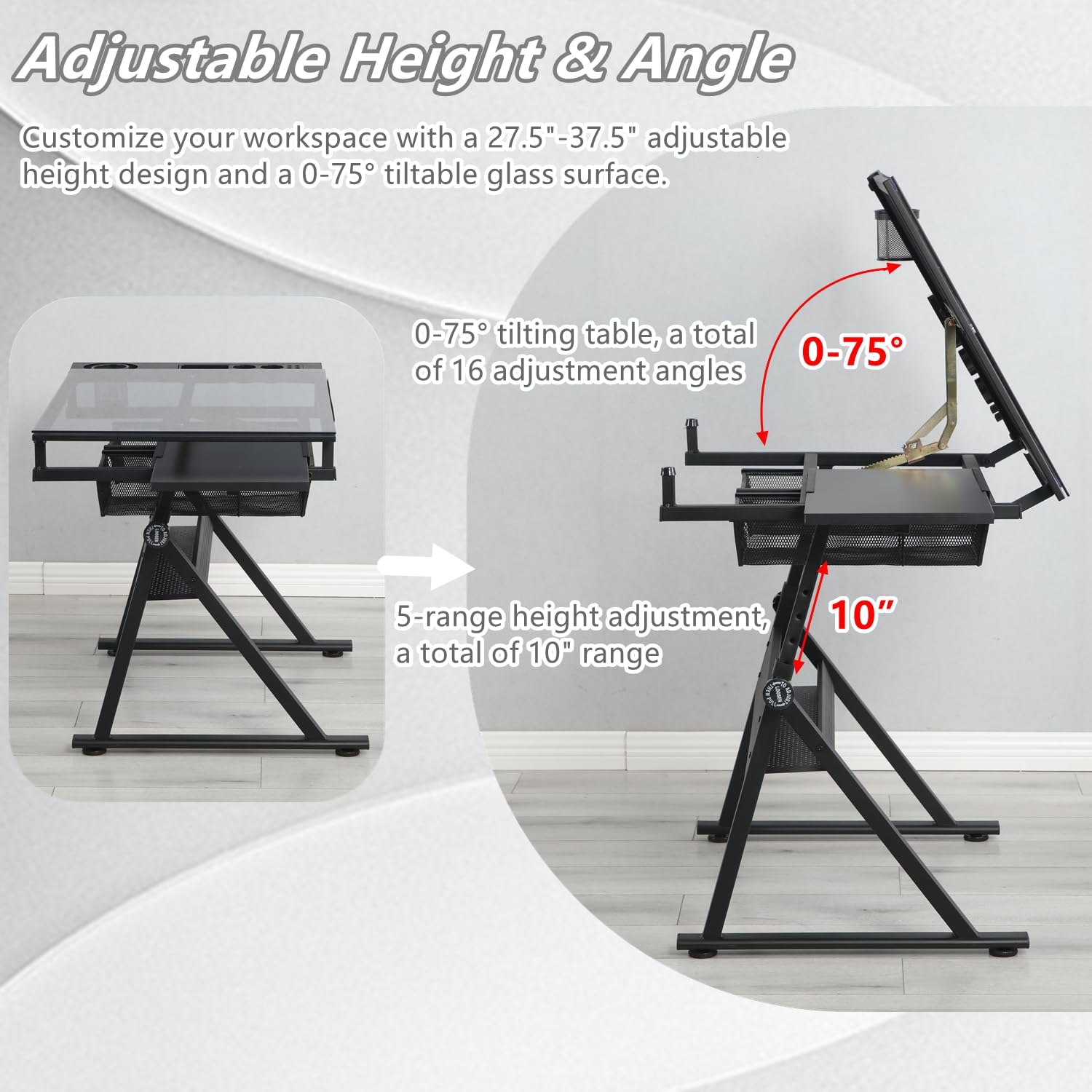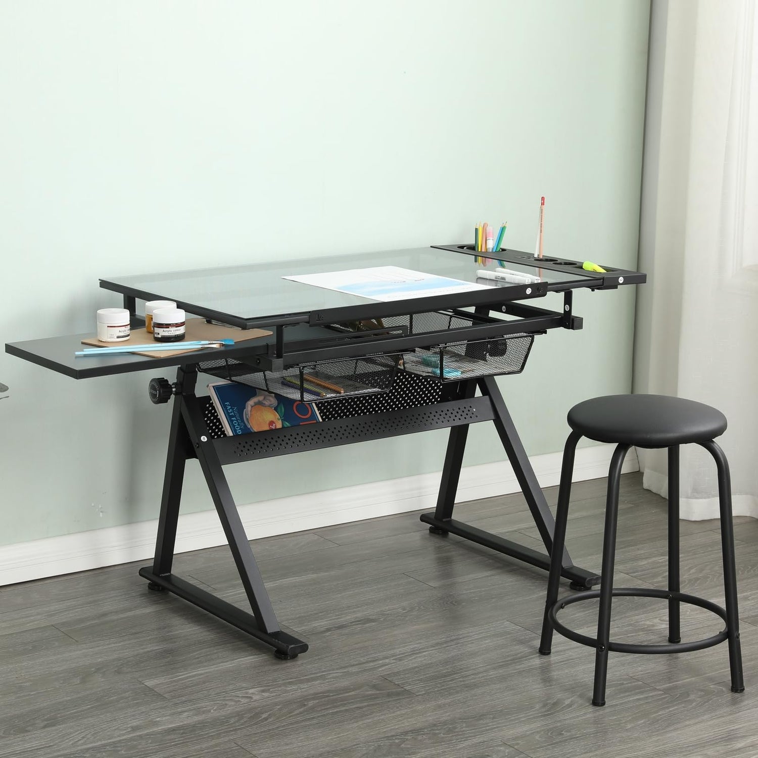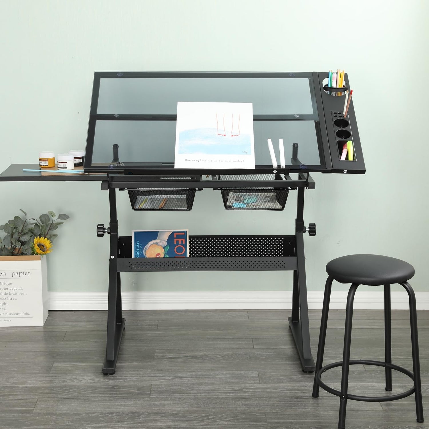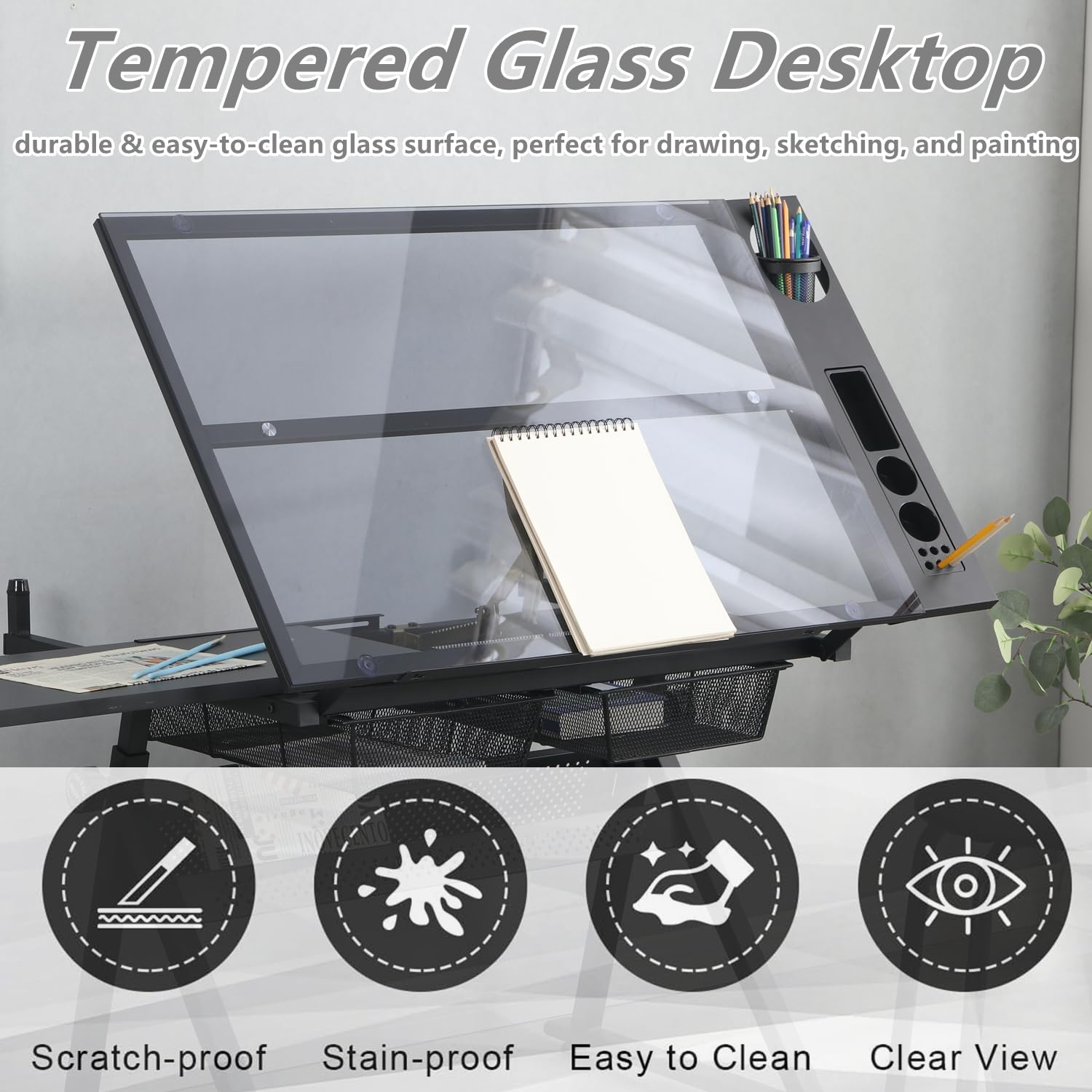- 🍀Premium Glass Surface Art Table: The durable, easy-to-clean full-transparent glass tabletop provides a smooth and stable surface for all your creative projects, from sketching to drafting.