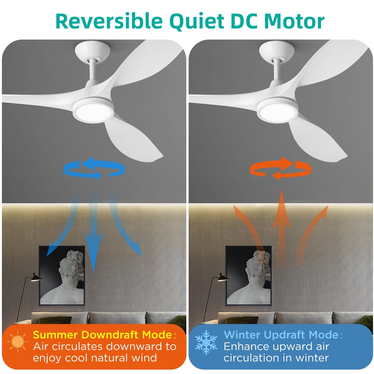 - Quiet Reversible DC Motor:This ceiling fan features a quiet reversible DC motor;In the summer, it rotates in the forward direction, creating a cool airflow that helps lower the temperature in the room;In the winter, it switches to reverse mode, distributing warm air from the ceiling evenly throughout the room, thus reducing energy costs