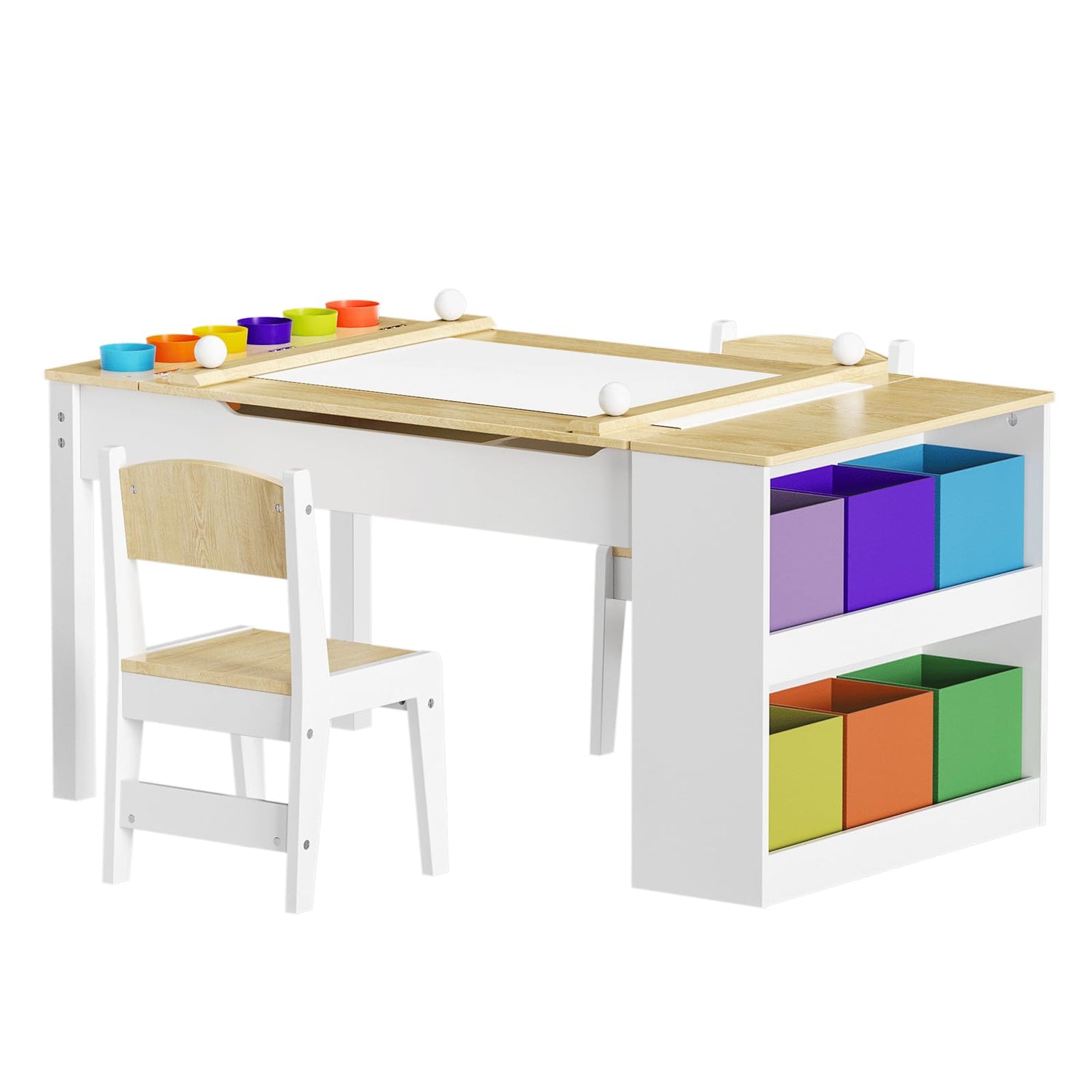- Ample Storage Space: The kids table and chairs comes with side storage cloth boxes for storing items and there is extra storage space under the tabletop for art supplies, toys and books, keeping them organized, creating a tidy play area, promoting creativity and concentration, also easy to access.