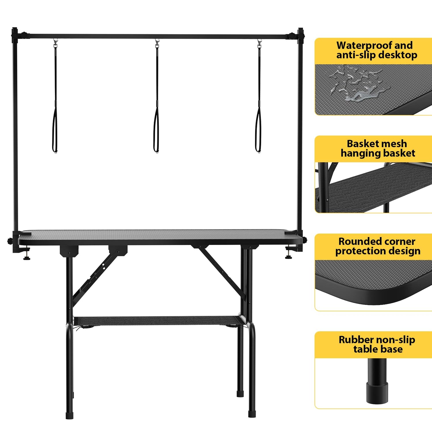 - Foldable & Portable: The pet grooming table adopts a foldable leg design, which is easy to store when not in use and saves space. The triangular bracket structure is used to improve the load-bearing and stability of the table, with a maximum weight of 300 pounds. Non-slip insulated rubber feet keep the table safe when working on the floor
