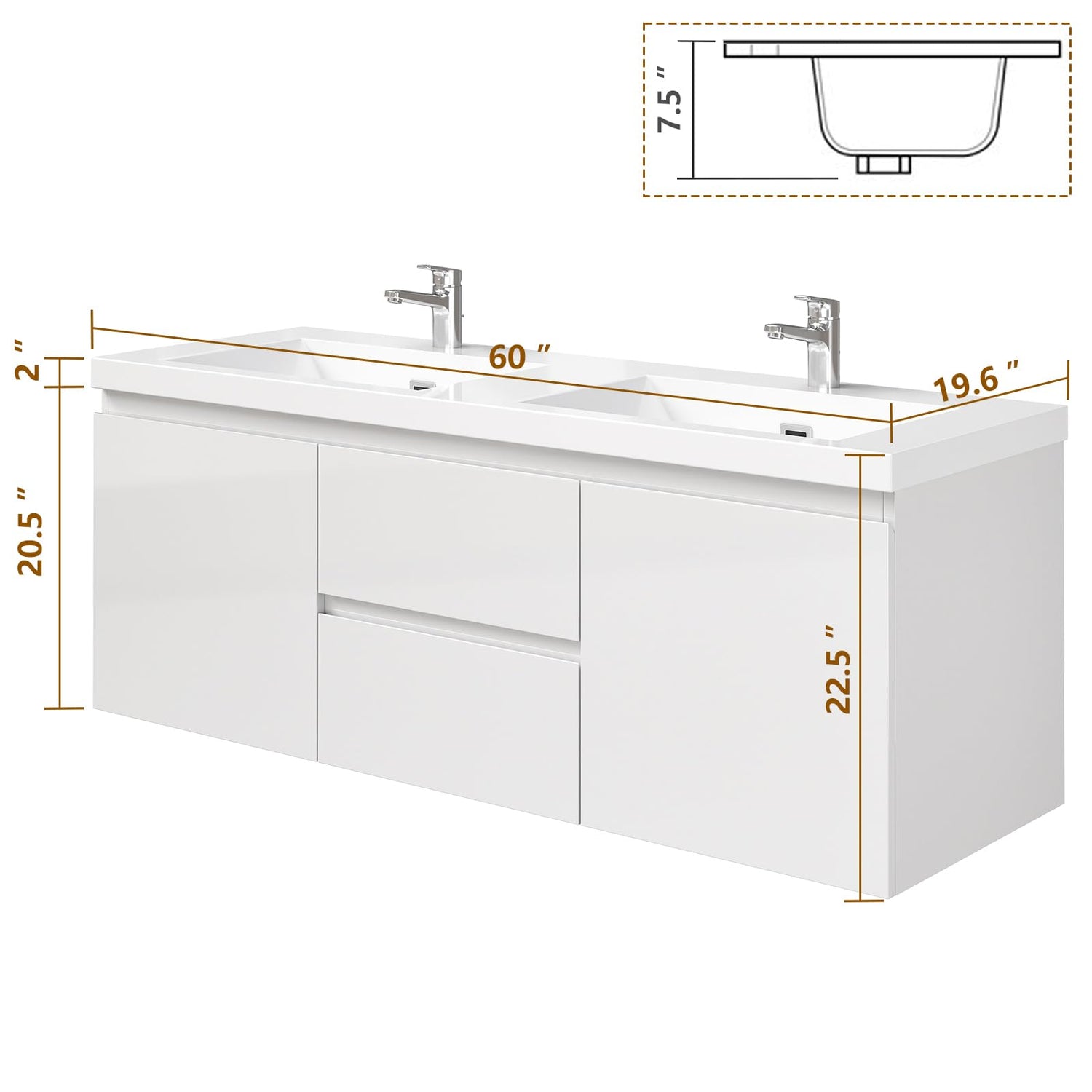 ROOMTEC 60 Inch Floating Bathroom Vanity with Double Undermount Sink Wall Mounted Bathroom Storage Vanity Cabinet of 2 Drawers and Doors