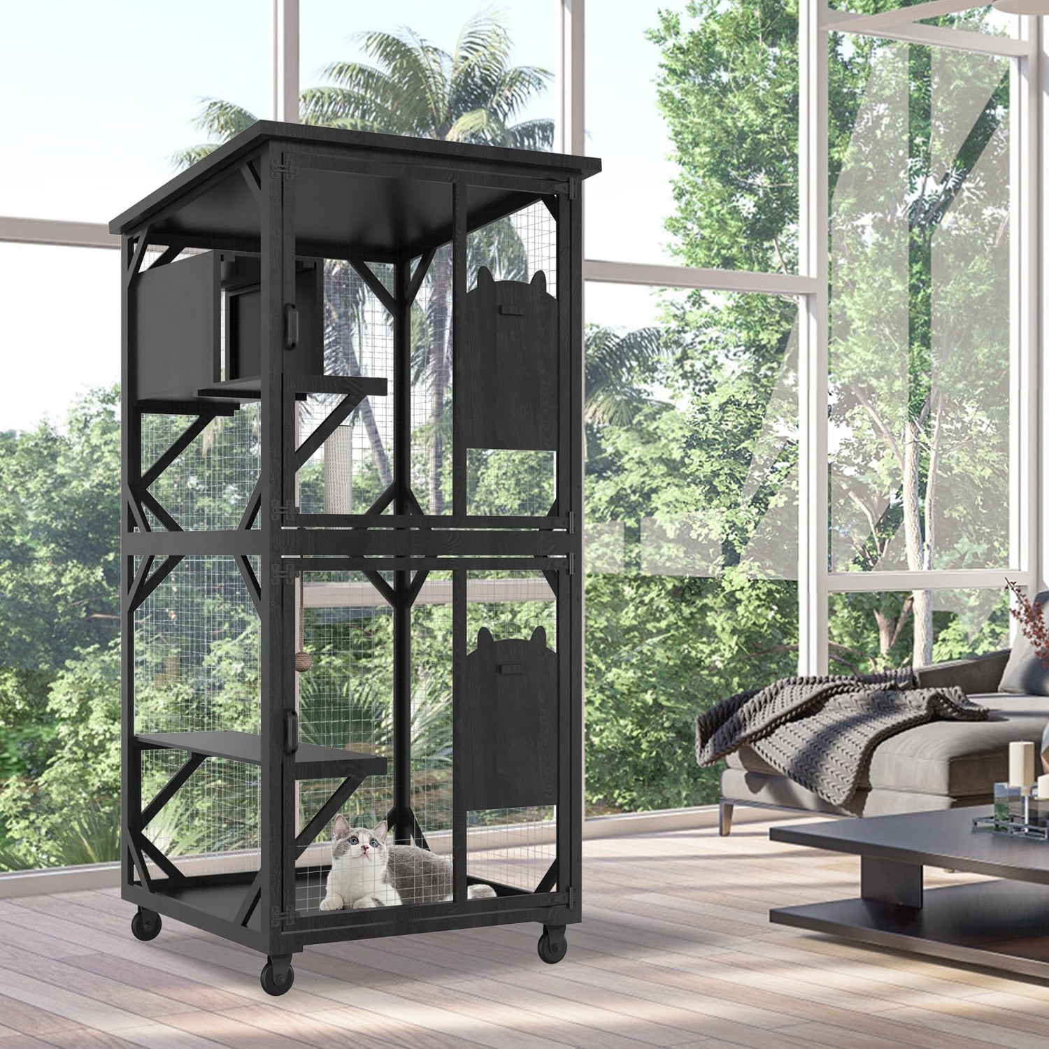 ROOMTEC Catio Outdoor Enclosure With Roof - 71" Height Wooden House, Large Cage With 3 Jumping Platforms and 1 Napping House for Cat Activity (Black)
