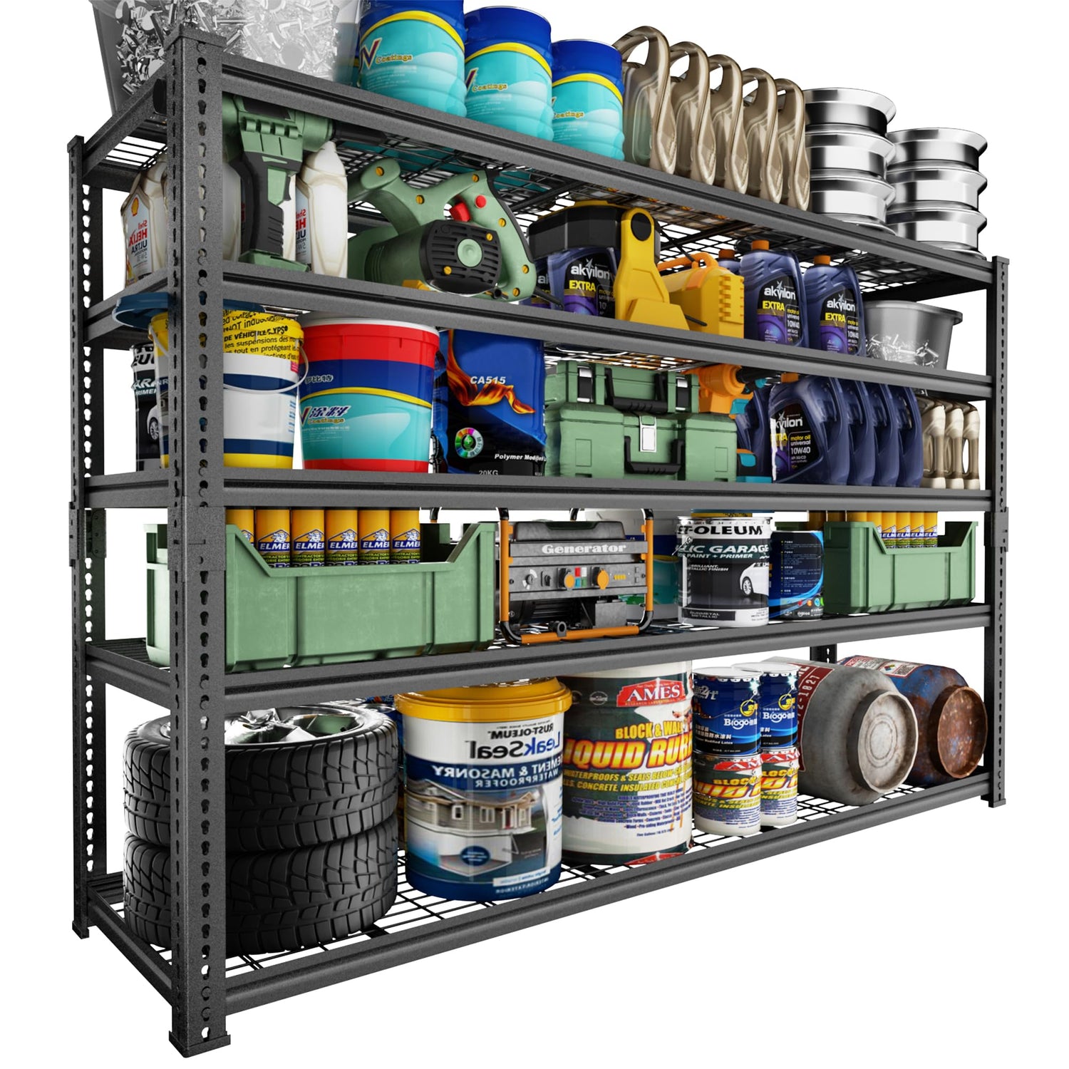 1. 2500LBS Heavy Duty Storage Shelves, each layer can withstand a weight of 485 pounds, with a total bearing capacity of 2500 pounds, perfect for organizing all sorts of items in your garage, kitchen, or laundry room