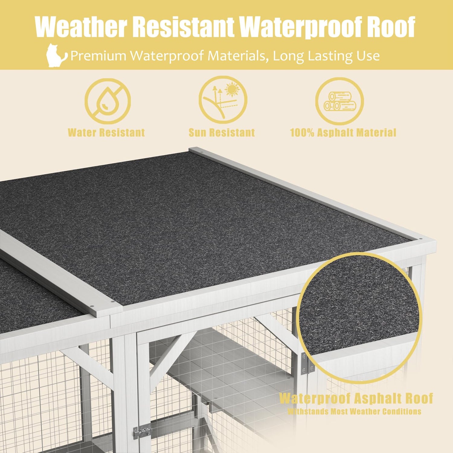 - 【UV-PROOF & WATERPROOF】Wooden outdoor catio is equipped with high quality durable asphalt roof, providing your pet with weatherproof outdoor shelter and sunbathing place, which is very suitable for garden or backyard.