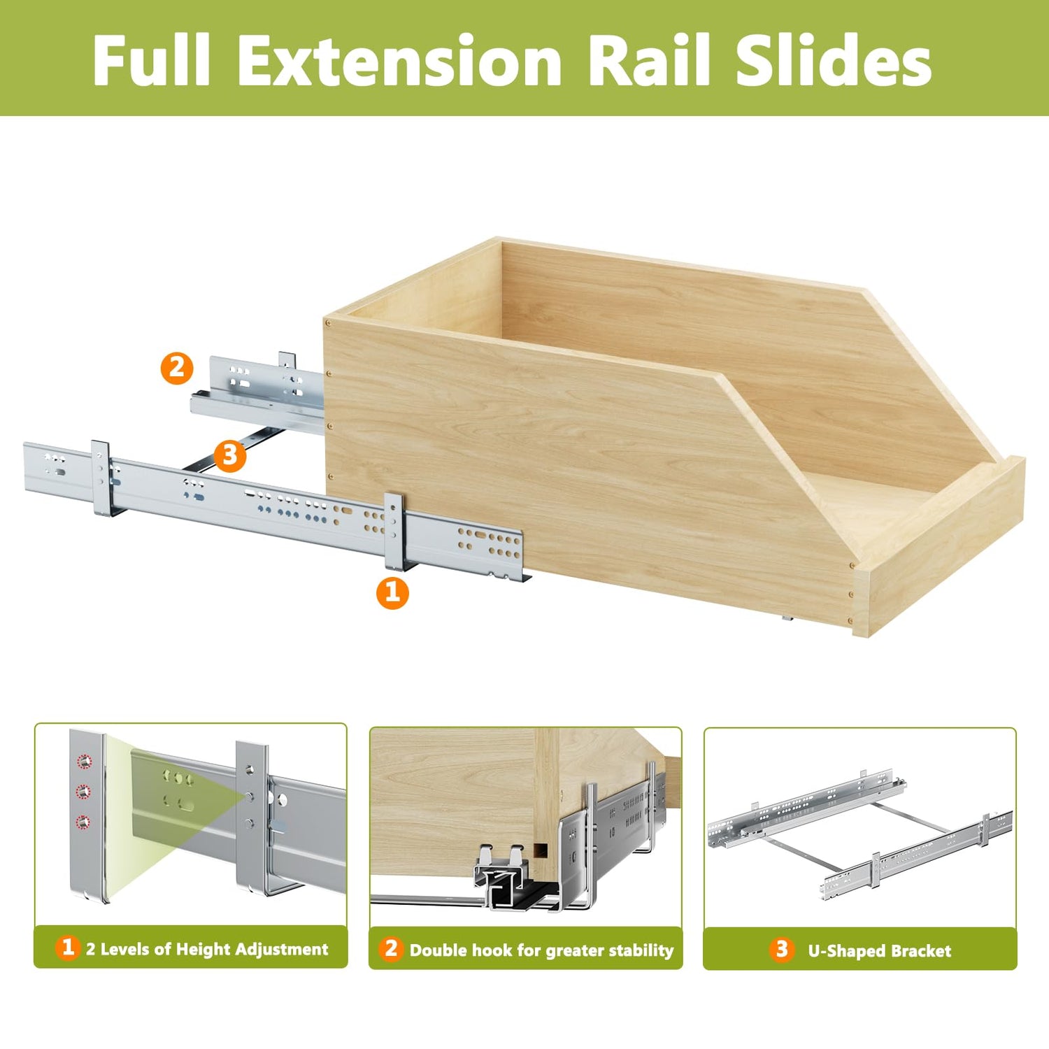 - EXCELLENT QUALITY — The 100-pound load-bearing full-tension sliding system adopts a pull-out design with soft-close function, making it easy to enter and exit the high drawer storage organizer. The slide rail adopts thickened double fixed hidden soft closing slide rail and 2 U-shaped steel brackets, which greatly improves the stability and load-bearing capacity of the product.This pull out cabinet organizer is made from solid birch and oak wood, ensuring product durability and high quality, providing a long-lasting life for your kitchen.