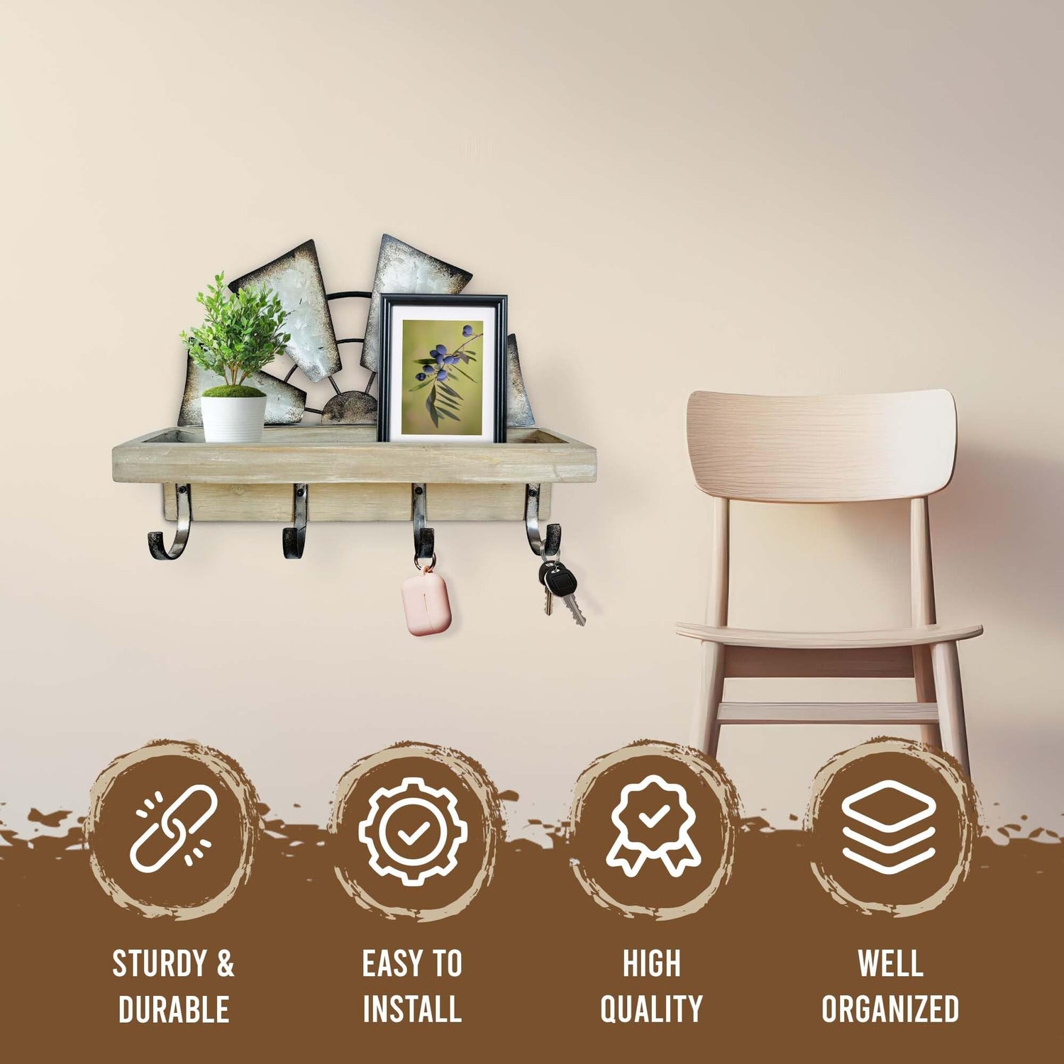 • ๐—ฆ๐˜๐˜‚๐—ฟ๐—ฑ๐˜† & ๐——๐˜‚๐—ฟ๐—ฎ๐—ฏ๐—น๐—ฒ: Crafted from high-quality white brushed wood, our 11.8โ€ x 3โ€ key and mail holder for wall features durable prong hooks and sturdy blade material. This wall shelf with hooks ensures your home is a clutter-free and organized space. It is a perfect key organizer wall mount.