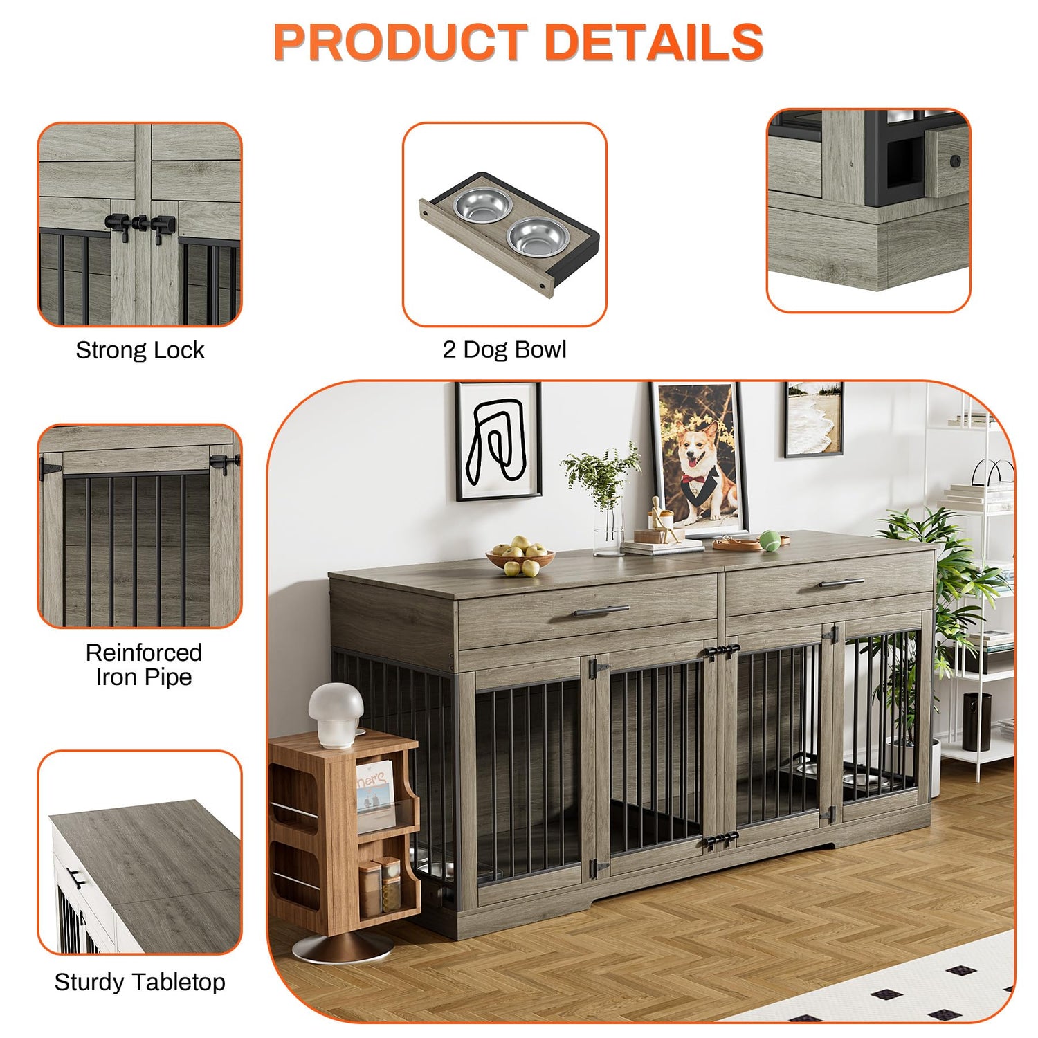 Rophefx Large Dog Crate Furniture for 2 Dogs, 72" Double Dog Kennel Indoor Furniture with 2 Storage Drawers and Removable Divider, Wooden Dog Cage with 4 Bowls, Dog House TV Stand, Rustic Grey