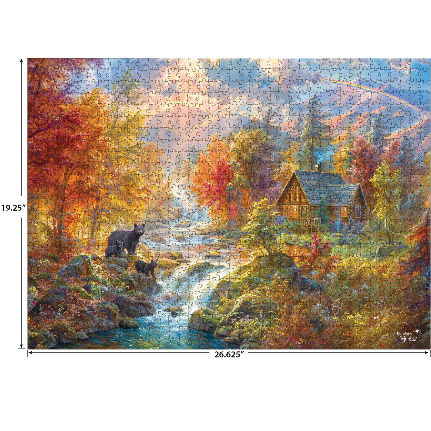 Details: Dive into the picturesque beauty of nature with RoseArt's "Autumn at Rainbow Falls" puzzle, showcasing the captivating artwork of signature artist Abraham Hunter. This stunning puzzle transports you to a peaceful autumn landscape with a mama bear and her two cubs exploring the riverside, and a quaint log cabin in the distance. Crafted with meticulous attention to detail, this puzzle boasts premium-quality imagery that captures the essence of rural charm. Each piece is expertly cut from European premium puzzle board, ensuring durability and a seamless fit as you piece together the puzzle. With fully interlocking pieces, you'll experience a satisfying "snap" with every connection, enhancing the joy of puzzling. An excellent gifting option for birthdays and holidays, "Autumn at Rainbow Falls" provides a delightful opportunity to bond with loved ones while immersing yourself in the tranquility of the countryside. Whether enjoyed during cottage retreats, summer vacations, or cozy winter nights by the fire, puzzles offer a relaxing and rewarding experience for the whole family. Once completed, this captivating puzzle measures 19.25" x 26.625", creating a stunning masterpiece that soothes the soul. Plus, with a bonus puzzle poster included, you'll have an extra reference to assist you in your puzzle-building journey. Enhance your collection with RoseArt's "Autumn at Rainbow Falls" puzzle and bring the serene beauty of nature into your home.
