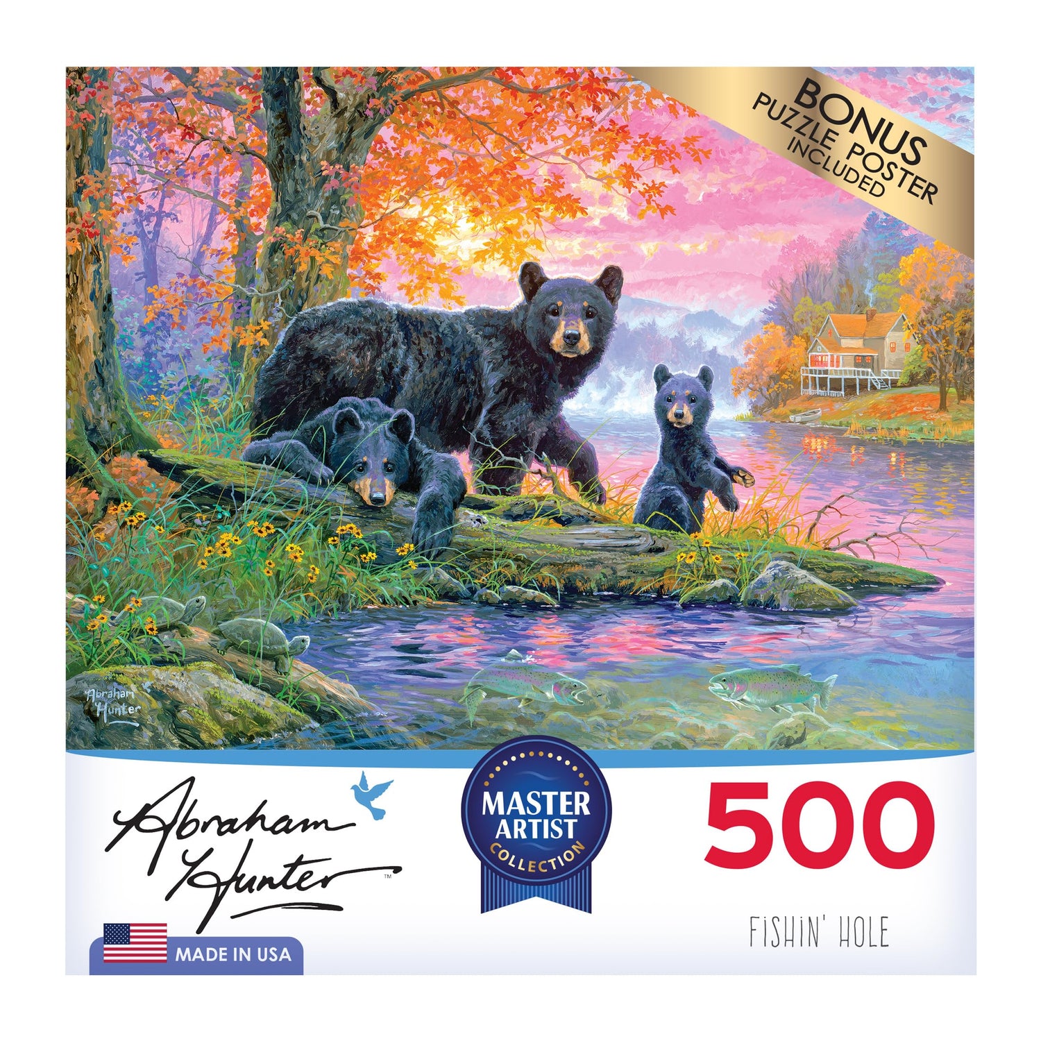 Details: "Fishin' Hole" by Abraham Hunter is a 500pc jigsaw puzzle made from sturdy premium puzzle board, you will feel the weight and quality in every piece. Each piece is fully interlocking and has a beautiful "snap" as you assemble the puzzle. Bonus puzzle poster included.