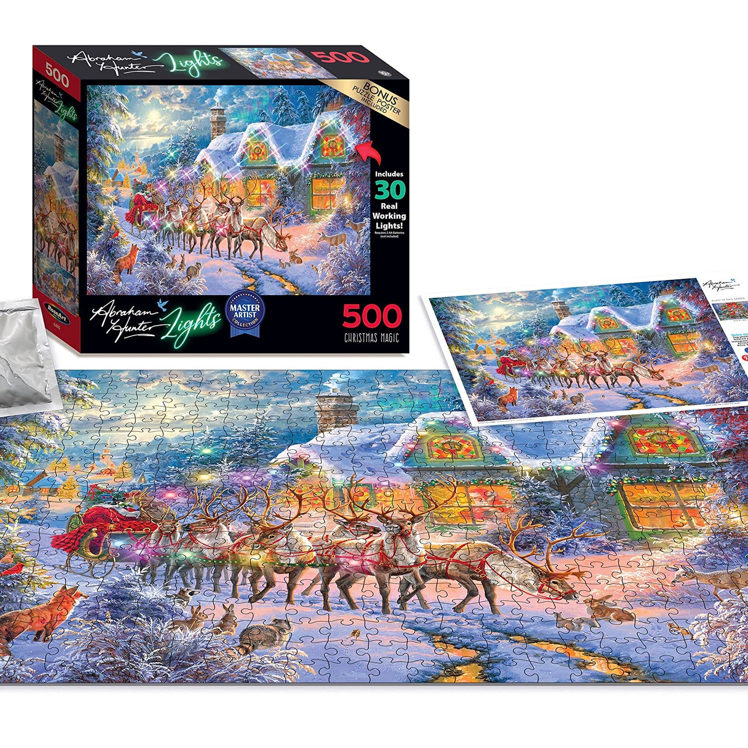 Details: Sure to become a family holiday tradition "Christmas Magic" 500pc Light Up jigsaw puzzle by Abraham Hunter incorporates 30 LED dazzling colored lights. Made from sturdy premium puzzle board, you will feel the weight and quality in every piece. Each piece is fully interlocking and has a beautiful "snap" as you assemble the puzzle. Includes: 1-500pc bagged jigsaw puzzle, puzzle glue, 30 LED lights that run on 2-AA batteries, a puzzle poster, and complete instructions.