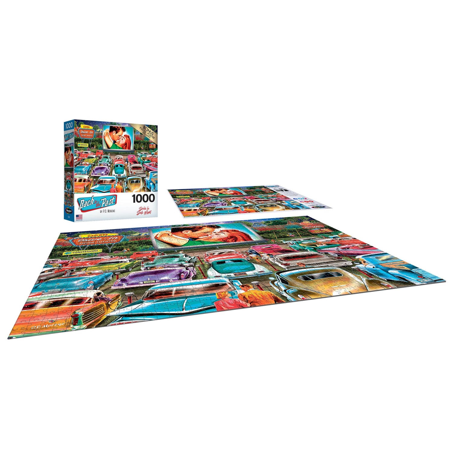 Details: Relive the golden era of drive-in theaters with the Back to the Past "Drive-In Date Night" 1000-piece jigsaw puzzle. This nostalgic puzzle captures the charm of a classic drive-in movie date, complete with vintage cars and a romantic atmosphere under the stars. Perfect for puzzle enthusiasts and fans of retro Americana, this puzzle offers both a challenging and rewarding experience. Made from sturdy premium puzzle board, you’ll experience superior quality and durability in every piece. Each of the 1000 interlocking pieces is designed to fit seamlessly, ensuring a smooth and satisfying assembly process. The pieces provide a satisfying "snap" as they lock into place, adding to the enjoyment of completing the puzzle. Whether you're new to puzzling or a seasoned enthusiast, the Back to the Past "Drive-In Date Night" puzzle provides a delightful and engaging challenge for all ages. Once finished, this nostalgic scene can be framed and displayed as a reminder of simpler times. A bonus puzzle poster is included to assist with assembly and can also be used for reference or as decoration. Order your "Drive-In Date Night" 1000-piece puzzle today and enjoy hours of fun while reminiscing about the magic of vintage movie nights!