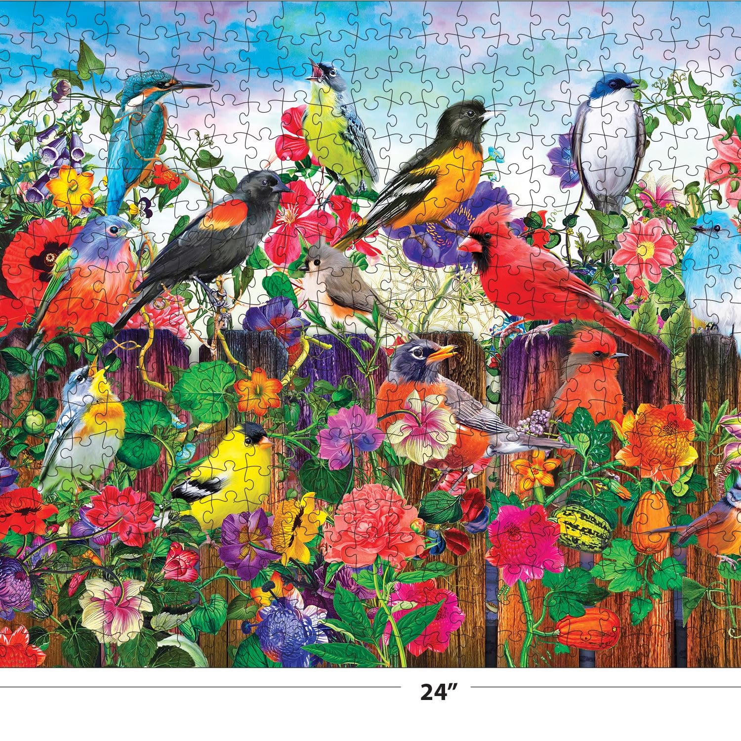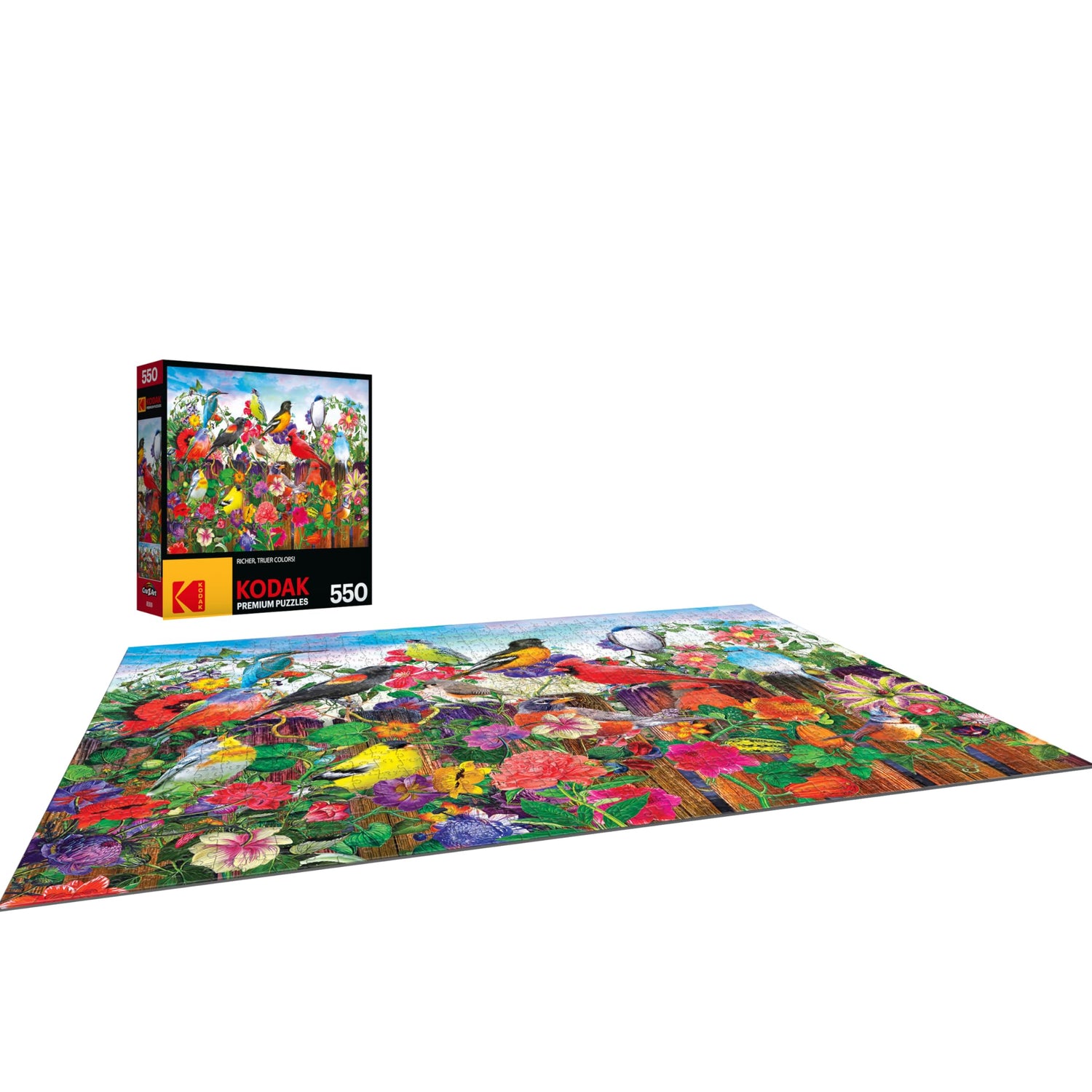 Details: Kodak 550 piece jigsaw puzzle "Birds and Blooms" by Aimee Stewart features a colorful array of songbirds perched on a fince in front of a beautiful flower garden. Kodak Premium Puzzles represents the highest quality imagery and puzzles available today. These are the brightest, richest, most colorful puzzles we have ever made. Mounted on European puzzle board, you will feel the weight and quality in every piece. Each piece is fully interlocking and has a beautiful "snap" as you assemble the puzzle. Bonus puzzle poster included.