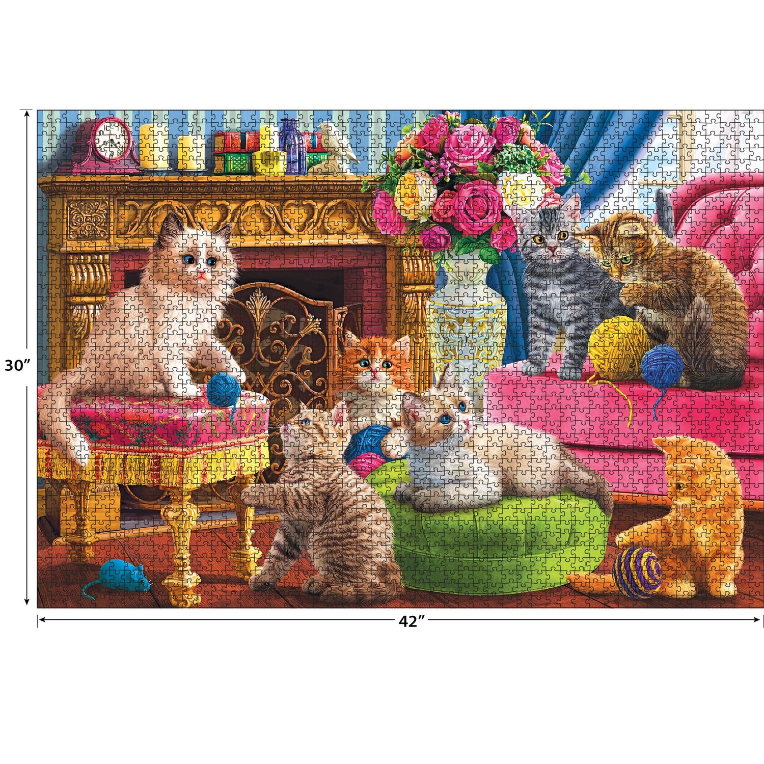 Details: Delight in the cozy charm of the Kodak Premium 3000-piece jigsaw puzzle, featuring the heartwarming scene of "Kittens by the Fireplace." This beautifully crafted puzzle showcases playful, furry felines gathered around a glowing hearth, making it the perfect choice for cat lovers and puzzle enthusiasts alike. Kodak Premium puzzles represent the pinnacle of puzzle quality, offering the brightest, richest, and most vibrant imagery available today. Mounted on European premium puzzle board, this puzzle delivers exceptional durability and a luxurious feel. Each of the 3000 pieces is precisely cut to be fully interlocking, ensuring a smooth and satisfying "snap" as you assemble the puzzle. With a finished size of 30" x 42," this stunning masterpiece is ideal for framing and displaying in your home or as a thoughtful gift for friends and family. Whether you're tackling it solo or enjoying the experience with loved ones, the "Kittens by the Fireplace" jigsaw puzzle provides hours of rewarding fun and relaxation. Bring the warmth and whimsy of this charming scene to life with Kodak's unmatched quality and craftsmanship. Order your Kodak Premium 3000-piece jigsaw puzzle today and create a lasting memory piece by piece!
