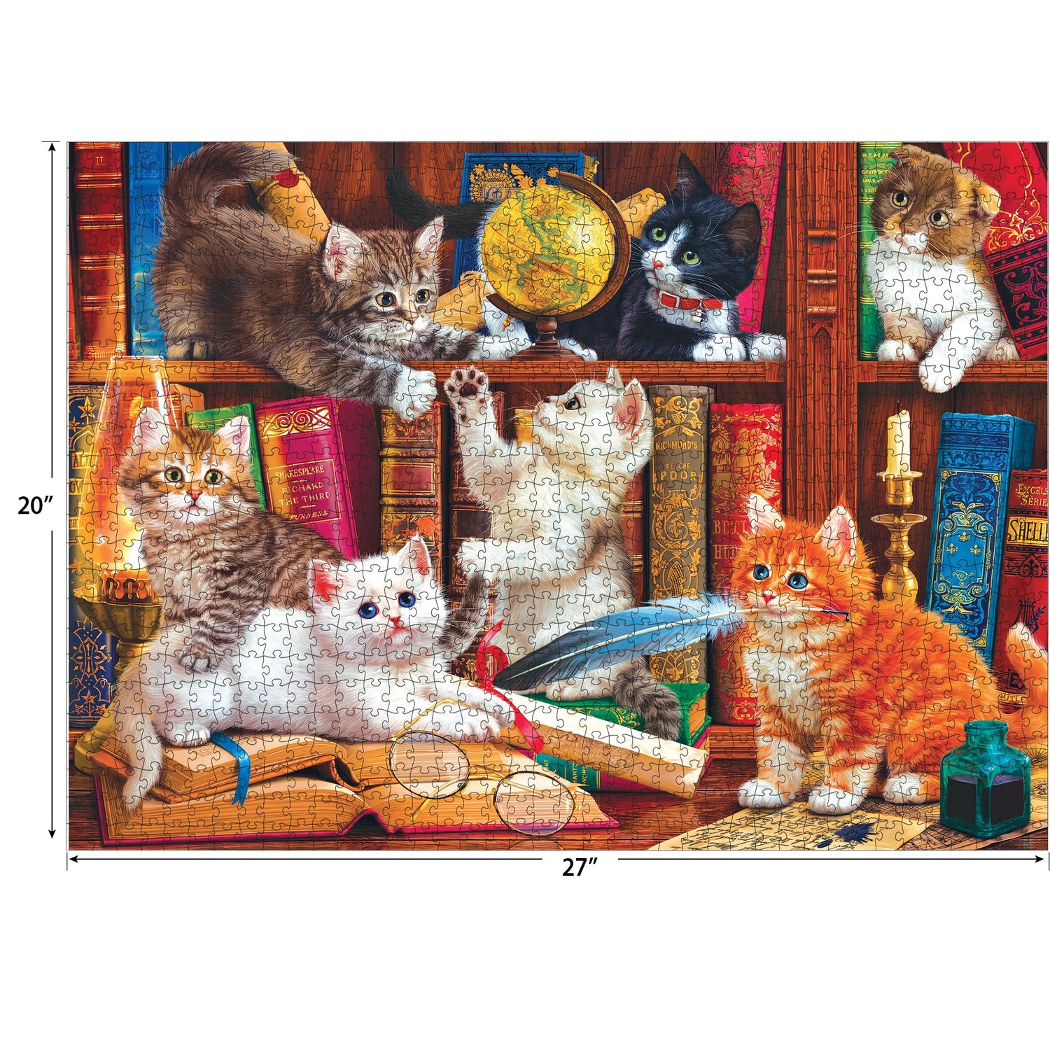 Details: KODAK 1000pc jigsaw puzzle "Library Mischief" features kittens playing on the library bookshelves. KODAK Premium puzzles represent the highest quality imagery and puzzles available today. These are the brightest, richest, most colorful puzzles. KODAK puzzles are durable and super satisfying to assemble. Bonus puzzle poster included.