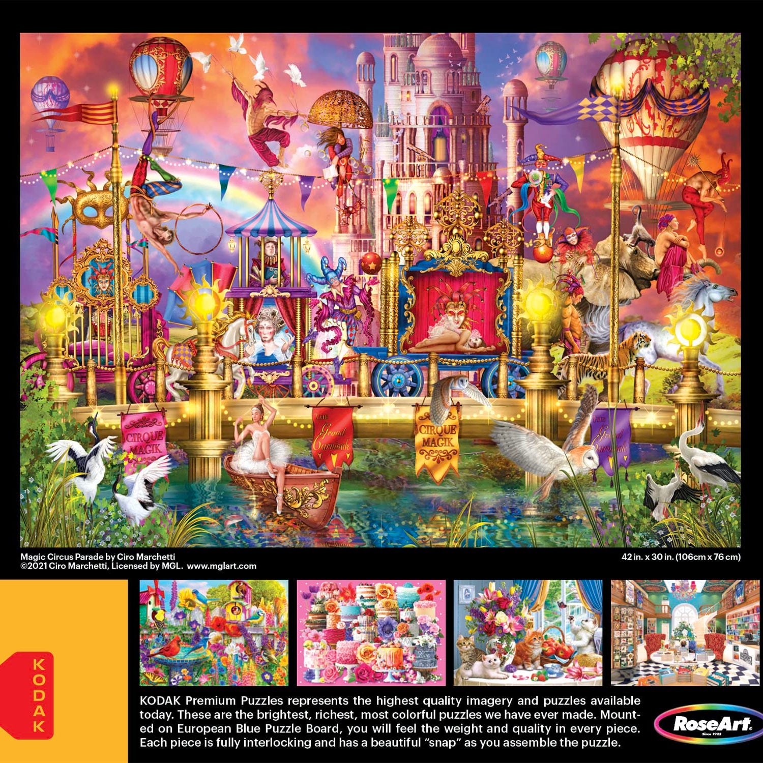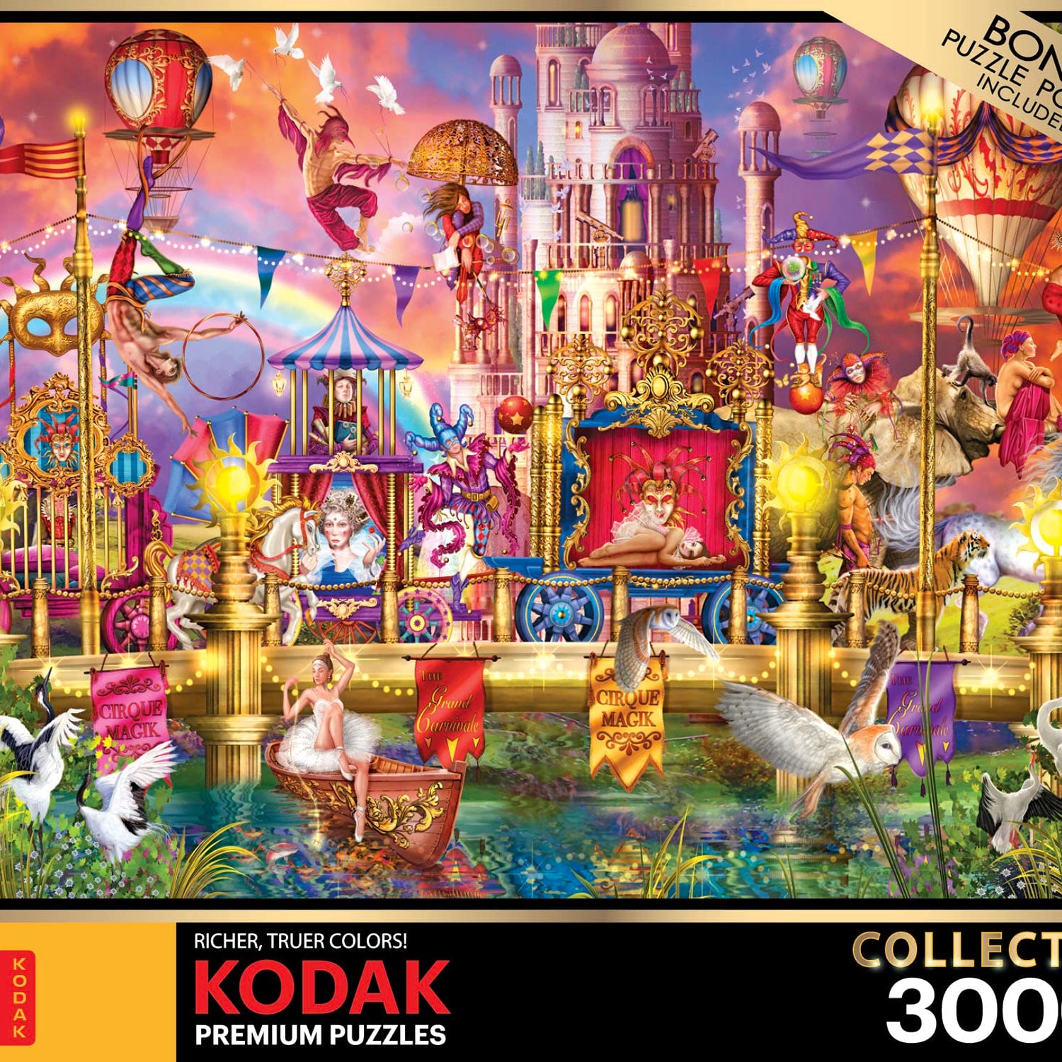Details: Kodak 3000 piece jigsaw puzzle "Magic Circus Parade" by Ciro Marchetti features a colorful, fantastical parade of hot air balloons, chariots, and more. Made from sturdy premium puzzle board, you will feel the weight and quality in every piece. Each piece is fully interlocking and has a beautiful "snap" as you assemble the puzzle. Bonus puzzle poster included.