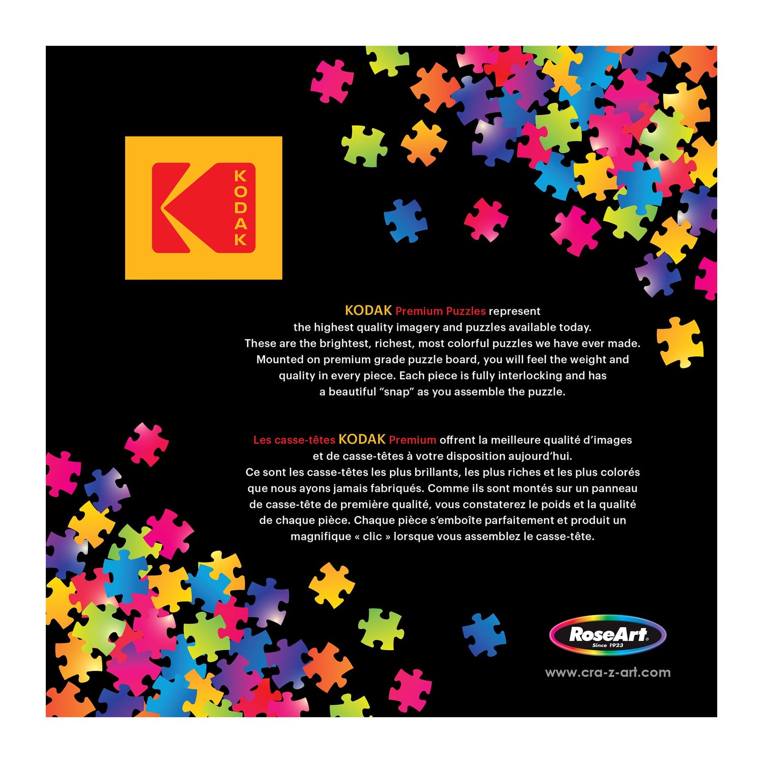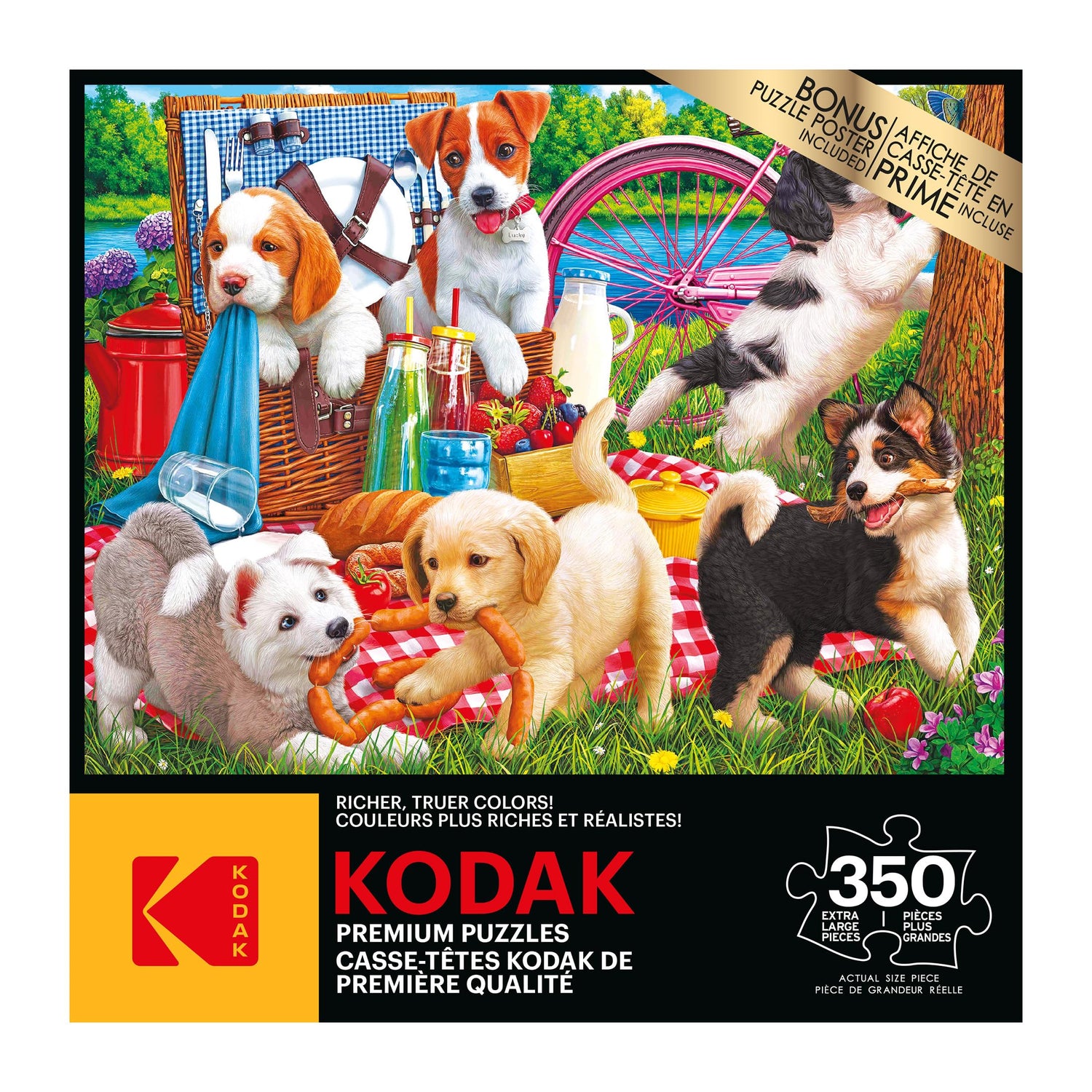 Details: "Puppies on a Picnic" 350pc jigsaw puzzle. KODAK Premium puzzles represent the highest quality imagery and puzzles available today. These are the brightest, richest, most colorful puzzles. KODAK puzzles are durable and super satisfying to assemble. Bonus puzzle poster included.