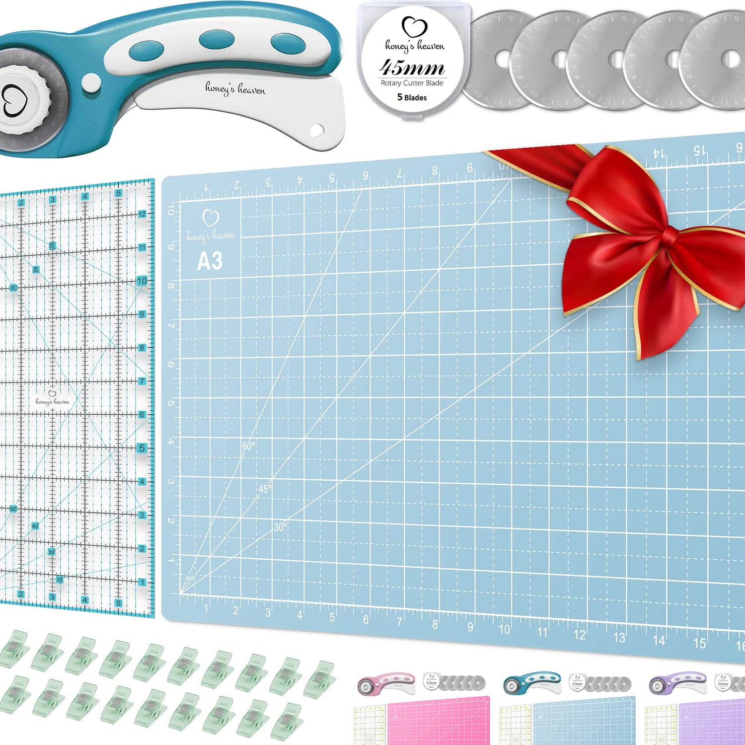 Rotary Cutter Set pink - Quilting Kit incl. 45mm Fabric Cutter, 5 Replacement Blades, A3 Cutting Mat, Acrylic Ruler and Craft Clips - Ideal for Crafting, Sewing, Patchworking, Crochet & Knitting