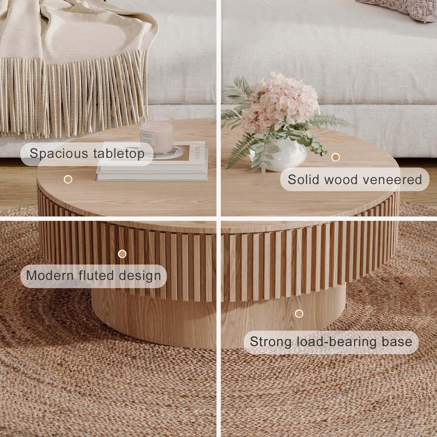 - Sturdy Construction: This circle coffee table is made of high-quality MDF which has excellent stability and durability. The solid wood veneer not only makes this center table more durable, but also can be kept as new after regular cleaning