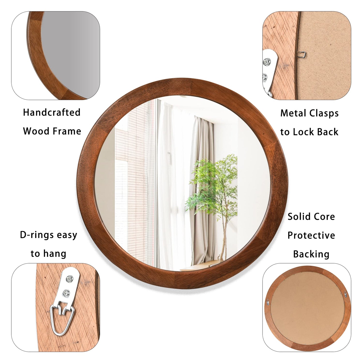 - [EASY TO HANG]The wooden wall round mirror is easy to be installed within minutes. It comes with two D rings hooks on the back.To be sure it securely attached on the back.